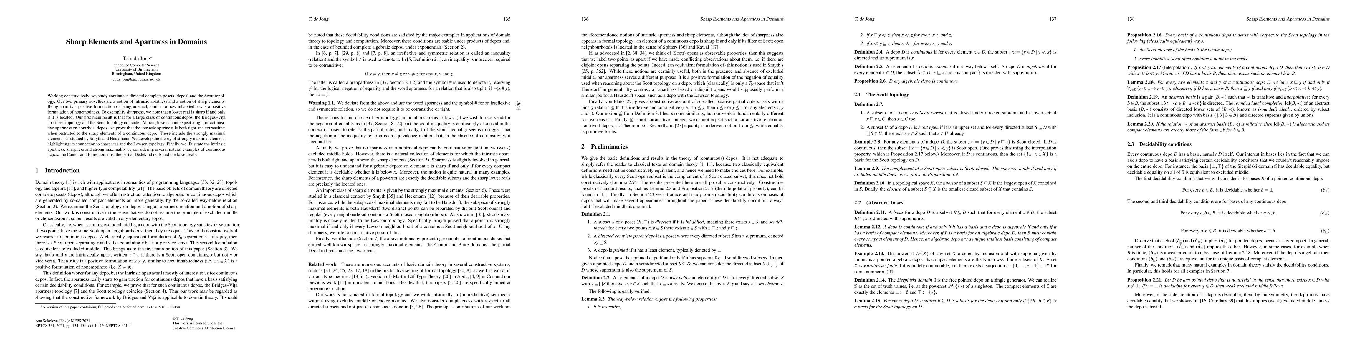 Working constructively, we study continuous directed complete posets (dcpos) and the Scott topology. Our two primary novelties are a notion of intrinsic apartness and a notion of sharp elements. Being apart is a positive formulation of being unequal, similar to how inhabitedness is a positive formulation of nonemptiness. To exemplify sharpness, we note that a lower real is sharp if and only if it is located. Our first main result is that for a large class of continuous dcpos, the Bridges-Vita apartness topology and the Scott topology coincide. Although we cannot expect a tight or cotransitive apartness on nontrivial dcpos, we prove that the intrinsic apartness is both tight and cotransitive when restricted to the sharp elements of a continuous dcpo. These include the strongly maximal elements, as studied by Smyth and Heckmann. We develop the theory of strongly maximal elements highlighting its connection to sharpness and the Lawson topology. Finally, we illustrate the intrinsic apartness, sharpness and strong maximality by considering several natural examples of continuous dcpos: the Cantor and Baire domains, the partial Dedekind reals and the lower reals.
