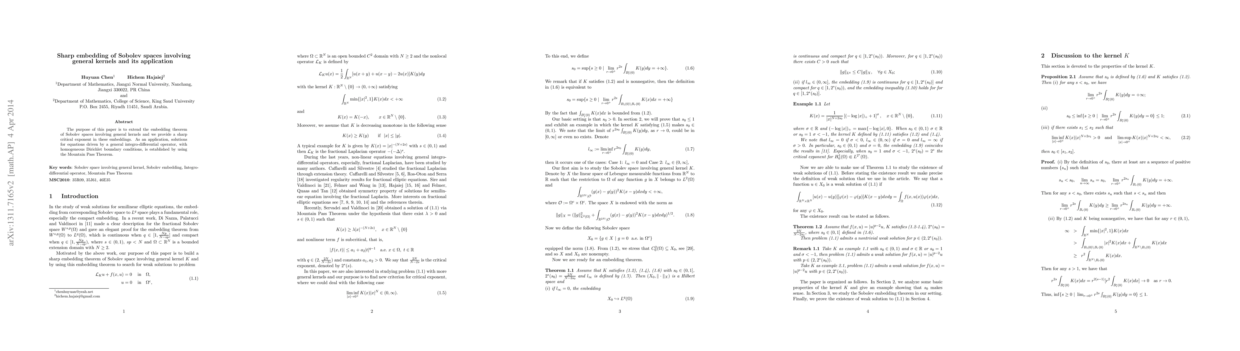 Summary: This paper extends the Sobolev embedding theorem for general kernels, establishing a sharp critical exponent, and applies it to derive solutions for integro-differential equations via the Mountain Pass Theorem under homogeneous Dirichlet conditions.