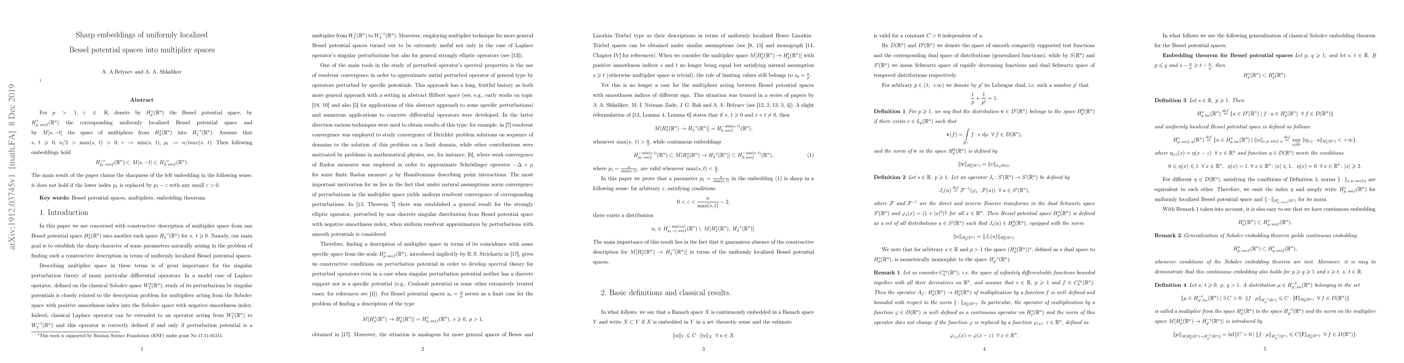 For $p > 1, \gamma \in \mathbb{R}$, denote by $H^{\gamma}_p(\mathbb{R}^n)$ the Bessel potential space, by $H^{\gamma}_{p, unif}(\mathbb{R}^n)$ the corresponding uniformly localized Bessel potential space and by $M[s, -t]$ the space of multipliers from $H^s_2(\mathbb{R}^n)$ into $H^{-t}_2(\mathbb{R}^n)$. Assume that $s, t \geqslant 0, n/2 > \max(s, t) > 0, r: = \min(s, t), p_1: = n/max(s, t)$. Then the following embeddings hold $$ H^{-r}_{p_1, unif}(\mathbb{R}^n) \subset M[s, -t] \subset H^{-r}_{2, unif}(\mathbb{R}^n). $$ The main result of the paper claims the sharpness of the left embedding in the following sense: it does not hold if the lower index $p_1$ is replaced by $p_1 -\varepsilon$ with any sufficiently small $\varepsilon > 0$.