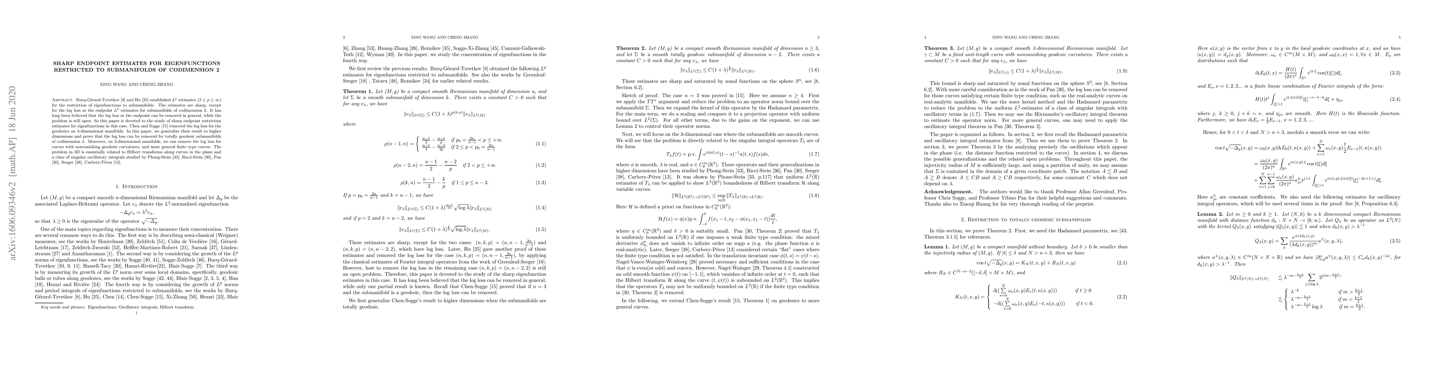 Burq-G\'erard-Tzvetkov and Hu established $L^p$ estimates ($2\le p\le \infty$) for the restriction of eigenfunctions to submanifolds. The estimates are sharp, except for the log loss at the endpoint $L^2$ estimates for submanifolds of codimension 2. It has long been believed that the log loss at the endpoint can be removed in general, while the problem is still open. So this paper is devoted to the study of sharp endpoint restriction estimates for eigenfunctions in this case. Chen and Sogge removed the log loss for the geodesics on 3-dimensional manifolds. In this paper, we generalize their result to higher dimensions and prove that the log loss can be removed for totally geodesic submanifolds of codimension 2. Moreover, on 3-dimensional manifolds, we can remove the log loss for curves with nonvanishing geodesic curvatures, and more general finite type curves. The problem in 3D is essentially related to Hilbert transforms along curves in the plane and a class of singular oscillatory integrals studied by Phong-Stein, Ricci-Stein, Pan, Seeger, Carbery-P\'erez.
