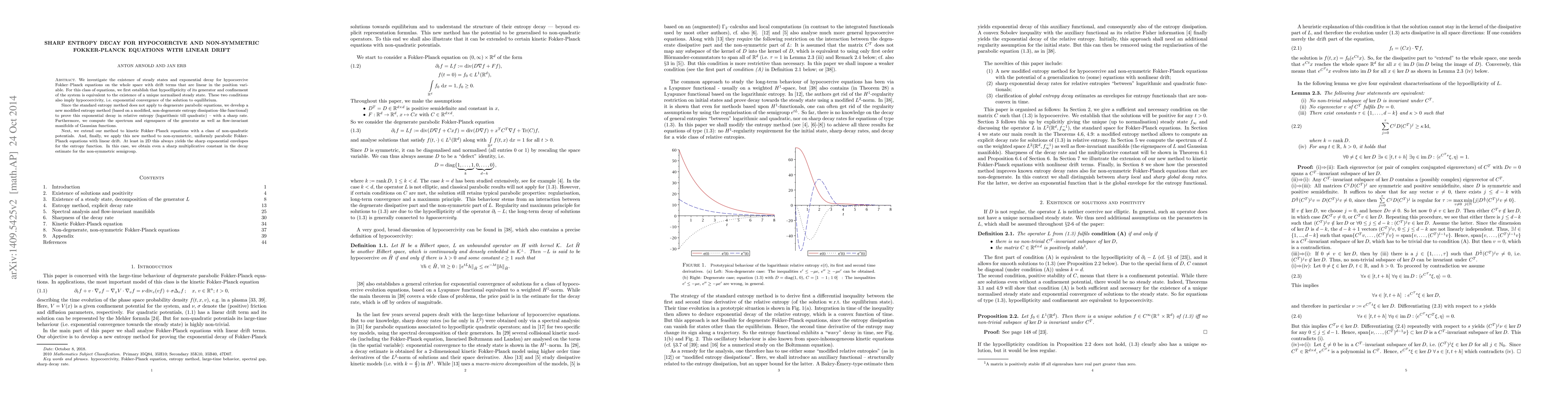 This paper establishes exponential decay rates for hypocoercive Fokker-Planck equations with linear drift, proving the existence of a unique steady state and developing a new entropy method for sharp decay estimates. The method extends to non-quadratic potentials and non-symmetric equations, yielding sharp exponential decay in 2D.