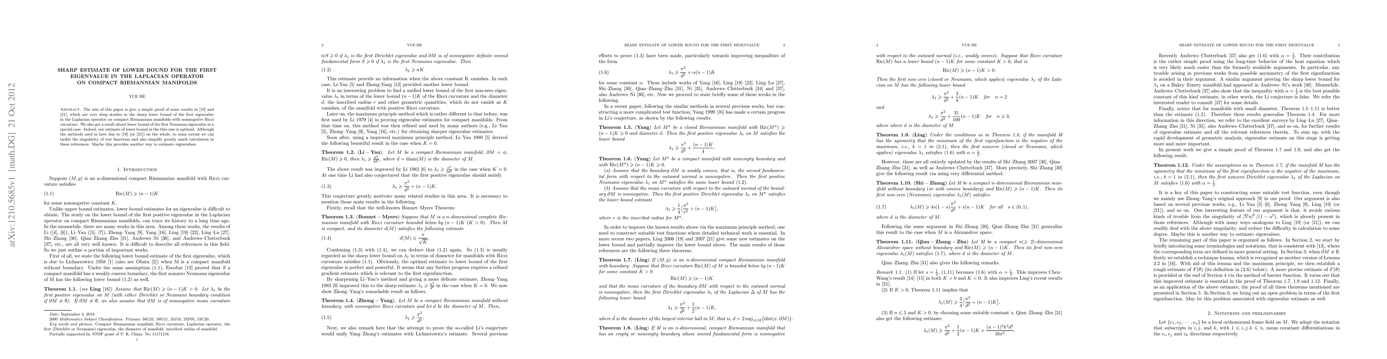 The aim of this paper is give a simple proof of some results in \cite{Jun Ling-2006-IJM} and \cite{JunLing-2007-AGAG}, which are very deep studies in the sharp lower bound of the first eigenvalue in the Laplacian operator on compact Riemannian manifolds with nonnegative Ricci curvature. We also get a result about lower bound of the first Neumann eigenvalue in a special case. Indeed, our estimate of lower bound in the this case is optimal. Although the methods used in here due to \cite{Jun Ling-2006-IJM} (or \cite{JunLing-2007-AGAG}) on the whole, to some extent we can tackle the singularity of test functions and also simplify greatly much calculation in these references. Maybe this provides another way to estimate eigenvalues.