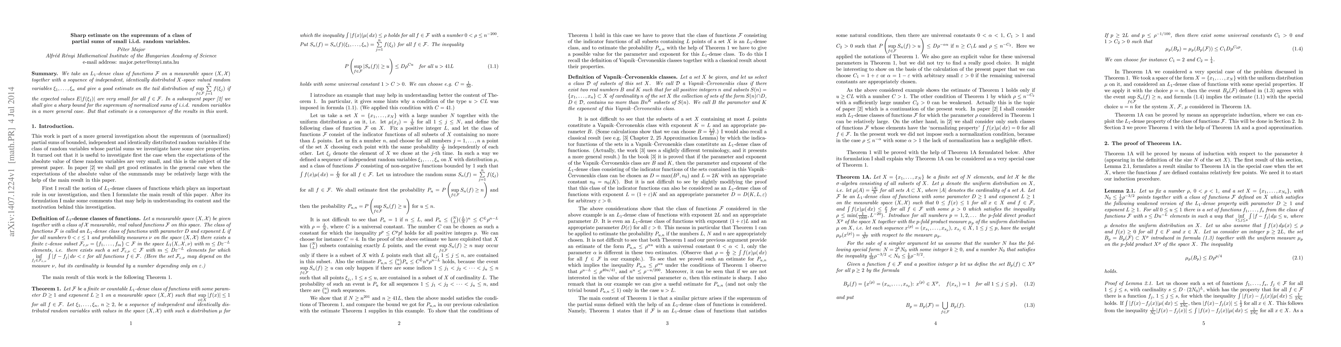 We take an $L_1$-dense class of functions $\Cal F$ on a measurable space $(X,\Cal X)$ together with a sequence of independent, identically distributed $X$-space valued random variables $\xi_1,\dots,\xi_n$ and give a good estimate on the tail distribution of $\sup_{f\in\Cal F}\sum_{j=1}^n f(\xi_j)$ if the expected values $E|f(\xi_1)|$ are very small for all $f\in\Cal F$. In a subsequent paper~[2] we shall give a sharp bound for the supremum of normalized sums of i.i.d. random variables in a more general case. But that estimate is a consequence of the results in this work.