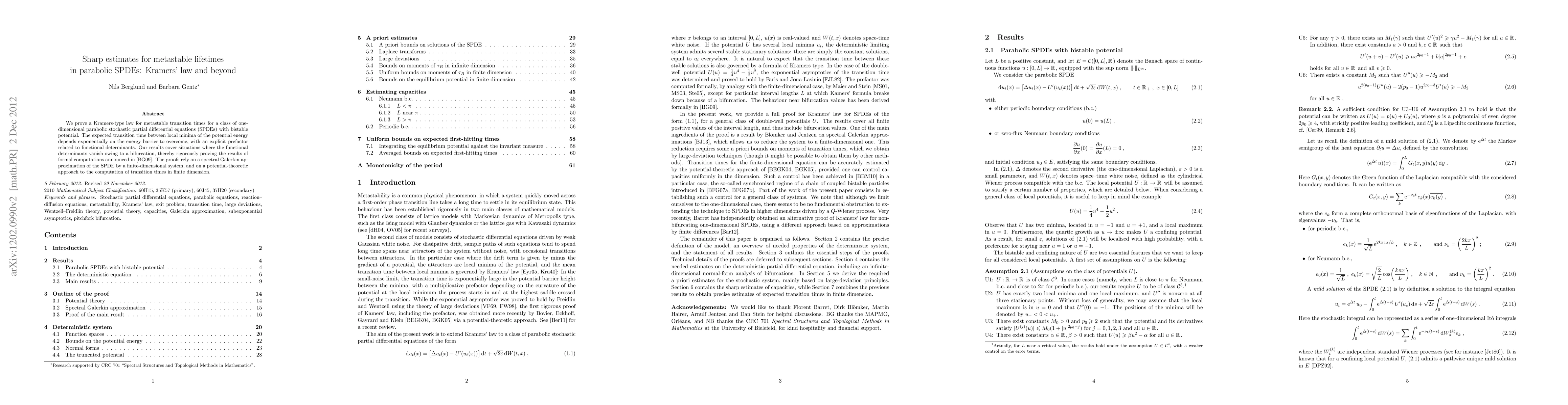 This paper establishes a Kramers-type law for metastable transition times in one-dimensional parabolic stochastic partial differential equations with a bistable potential, showing an exponential dependence on the energy barrier. It rigorously confirms earlier formal computations and uses spectral Galerkin approximation and potential-theoretic methods.