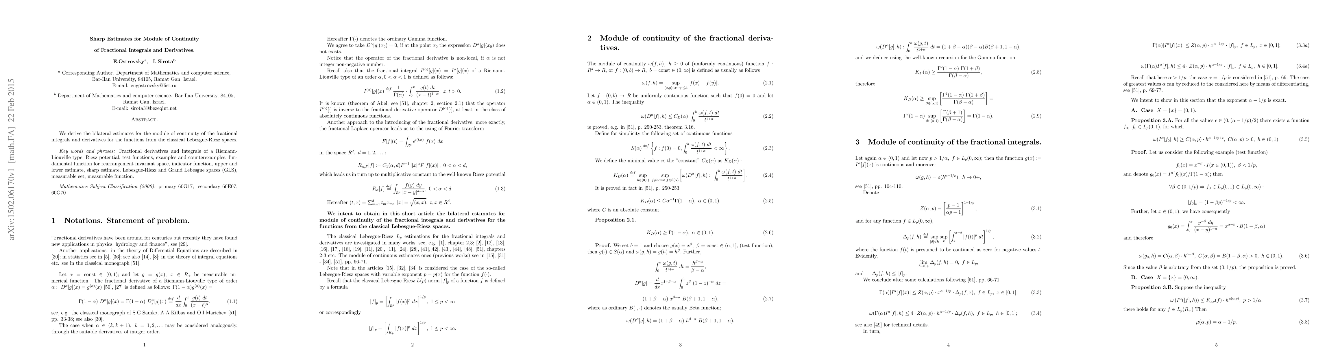 Summary: This paper provides sharp estimates for the module of continuity of fractional integrals and derivatives, focusing on functions from the classical Lebesgue-Riesz spaces, establishing bilateral estimates for these operations.