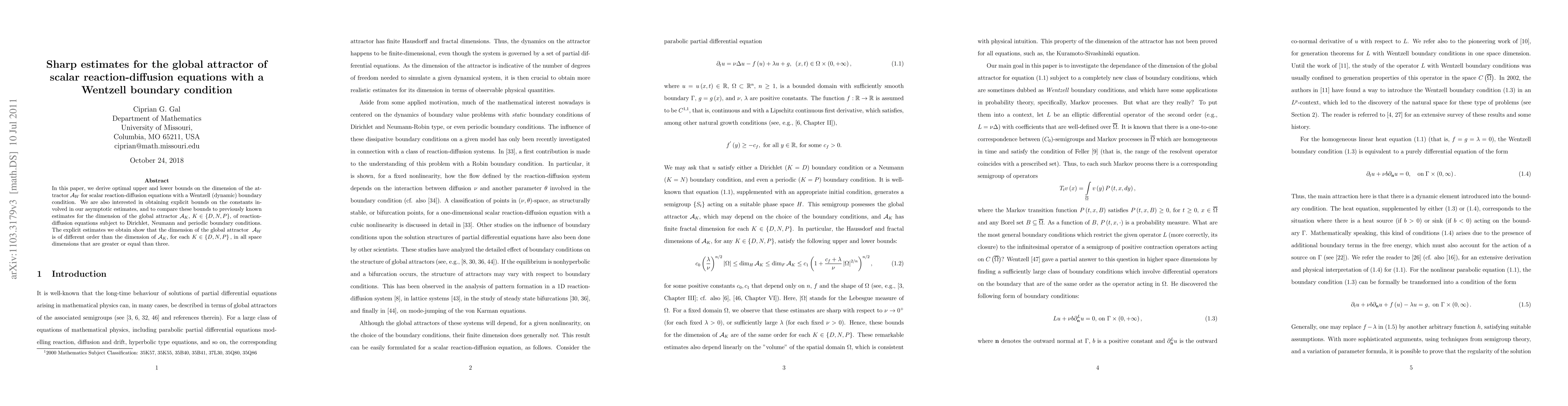 In this paper, we derive optimal upper and lower bounds on the dimension of the attractor AW for scalar reaction-diffusion equations with a Wentzell (dynamic) boundary condition. We are also interested in obtaining explicit bounds about the constants involved in our asymptotic estimates, and to compare these bounds to previously known estimates for the dimension of the global attractor AK; K \in {D;N; P}, of reactiondiffusion equations subject to Dirichlet, Neumann and periodic boundary conditions. The explicit estimates we obtain show that the dimension of the global attractor AW is of different order than the dimension of AK; for each K \in {D;N; P} ; in all space dimensions that are greater or equal than three.