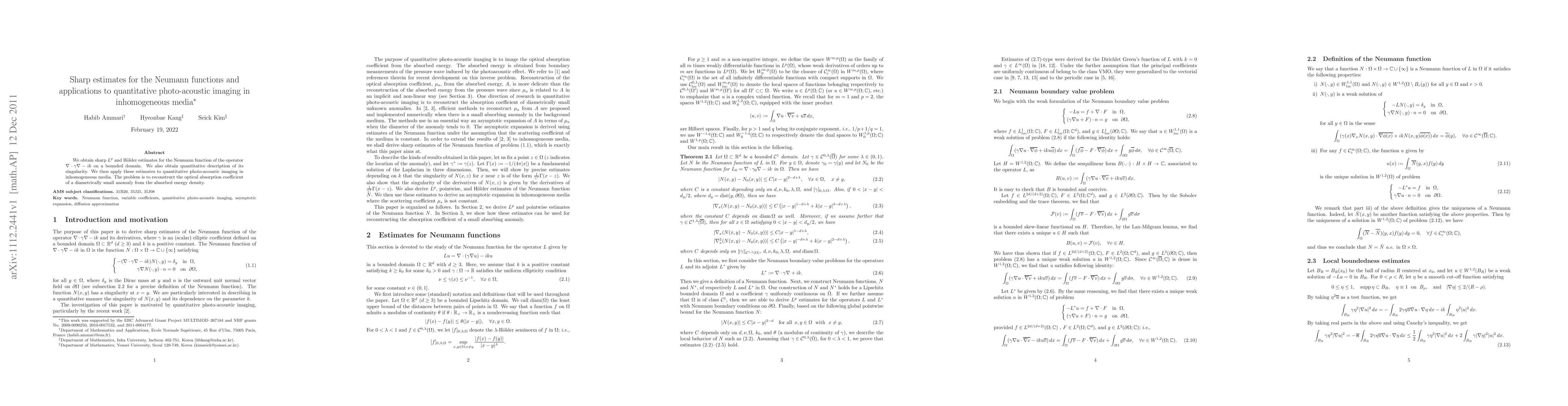 We obtain sharp $L^p$ and H\"older estimates for the Neumann function of the operator $\nabla \cdot \gamma \nabla - ik$ on a bounded domain. We also obtain quantitative description of its singularity. We then apply these estimates to quantitative photo-acoustic imaging in inhomogeneous media. The problem is to reconstruct the optical absorption coefficient of a diametrically small anomaly from the absorbed energy density.