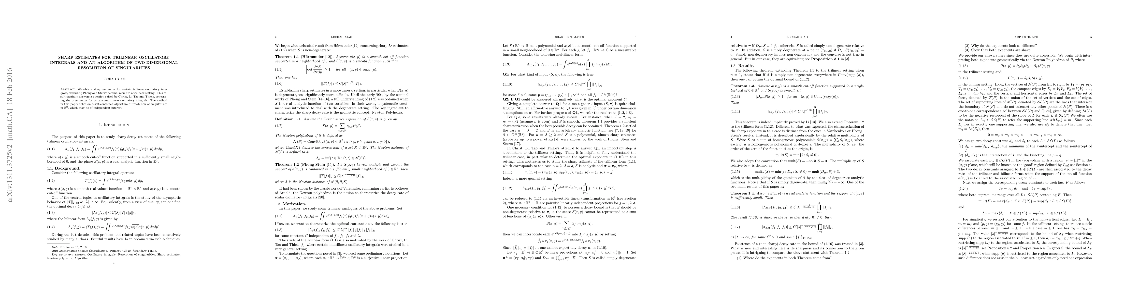 This paper provides sharp estimates for trilinear oscillatory integrals, extending Phong and Stein's results to a trilinear context. It also introduces a novel algorithm for resolving singularities in two-dimensional space, which stands as an independent contribution.