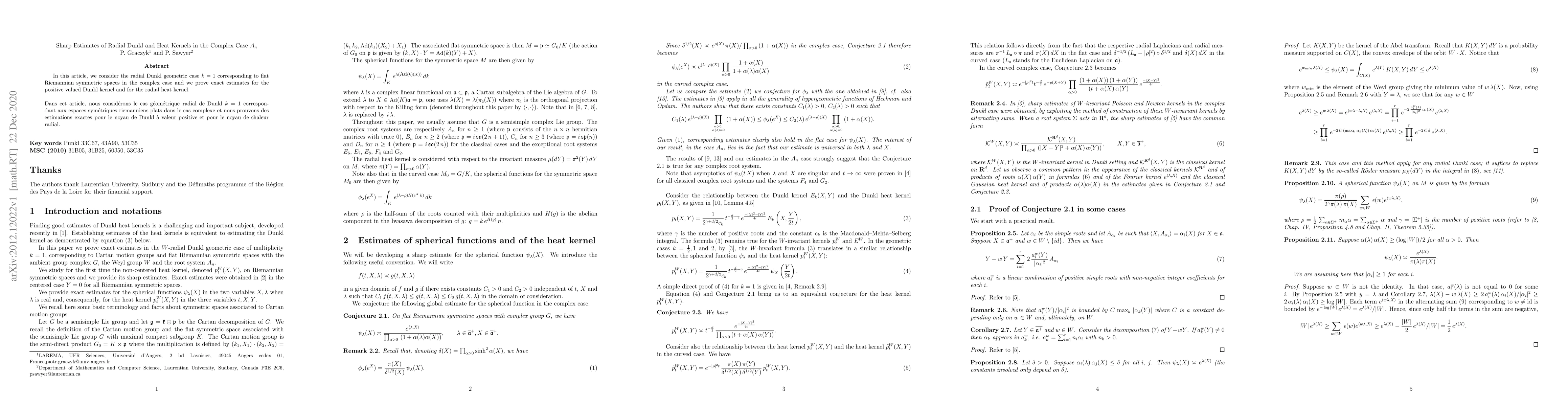 In this article, we consider the radial Dunkl geometric case $k=1$ corresponding to flat Riemannian symmetric spaces in the complex case and we prove exact estimates for the positive valued Dunkl kernel and for the radial heat kernel. Dans cet article, nous consid\'erons le cas g\'eom\'etrique radial de Dunkl $ k = 1 $ correspondant aux espaces sym\'etriques riemanniens plats dans le cas complexe et nous prouvons des estimations exactes pour le noyau de Dunkl \`a valeur positive et pour le noyau de chaleur radial