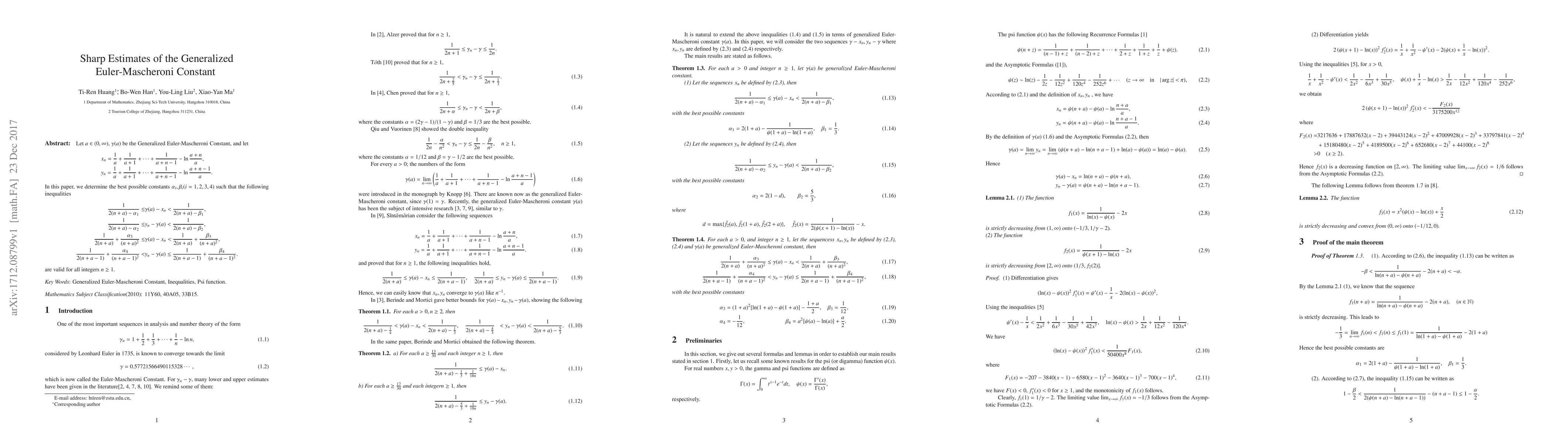 Let $a\in (0, \infty)$, $\gamma(a)$ be the Generalized Euler-Mascheroni Constant, and let \begin{align*} &x_n=\frac1a+\frac{1}{a+1}+\cdots+\frac{1}{a+n-1}-\ln\frac{a+n}{a},\\ &y_n=\frac1a+\frac{1}{a+1}+\cdots+\frac{1}{a+n-1}-\ln\frac{a+n-1}{a}. \end{align*} In this paper, we determine the best possible constants $\alpha_i, \beta_i (i=1,2,3,4)$ such that the following inequalities \begin{align*} \frac{1}{2(n+a)-\alpha_1}\leq &\gamma(a)-x_n< \frac{1}{2(n+a)-\beta_1},\\ \frac{1}{2(n+a)-\alpha_2}\leq &y_n-\gamma(a)< \frac{1}{2(n+a)-\beta_2},\\ \frac{1}{2(n+a)}+\frac{\alpha_3}{(n+a)^2}\leq &\gamma(a)-x_n<\frac{1}{2(n+a)}+\frac{\beta_3}{(n+a)^2},\\ \frac{1}{2(n+a-1)}+\frac{\alpha_4}{(n+a-1)^2}< &y_n-\gamma(a)\leq\frac{1}{2(n+a-1)}+\frac{\beta_4}{(n+a-1)^2}. \end{align*} are valid for all integers $n\geq 1$.