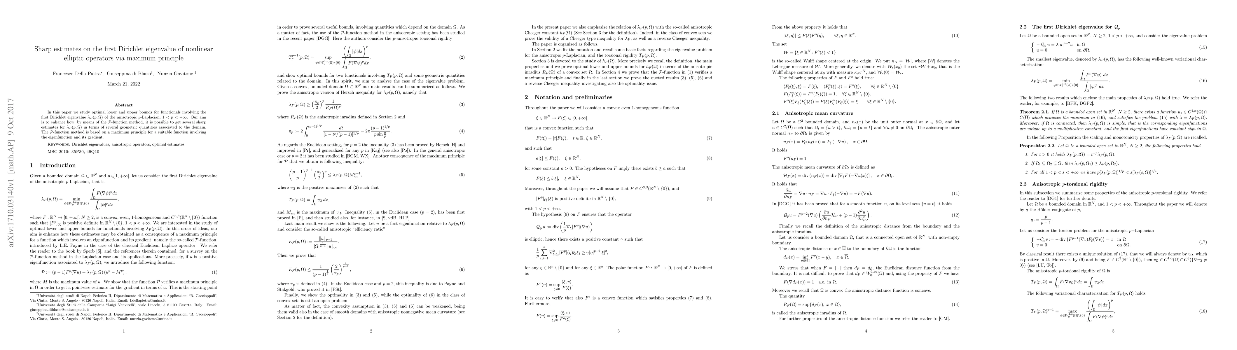 This paper uses a maximum principle method to derive sharp estimates for the first Dirichlet eigenvalue of nonlinear elliptic operators, relating it to geometric quantities of the domain.