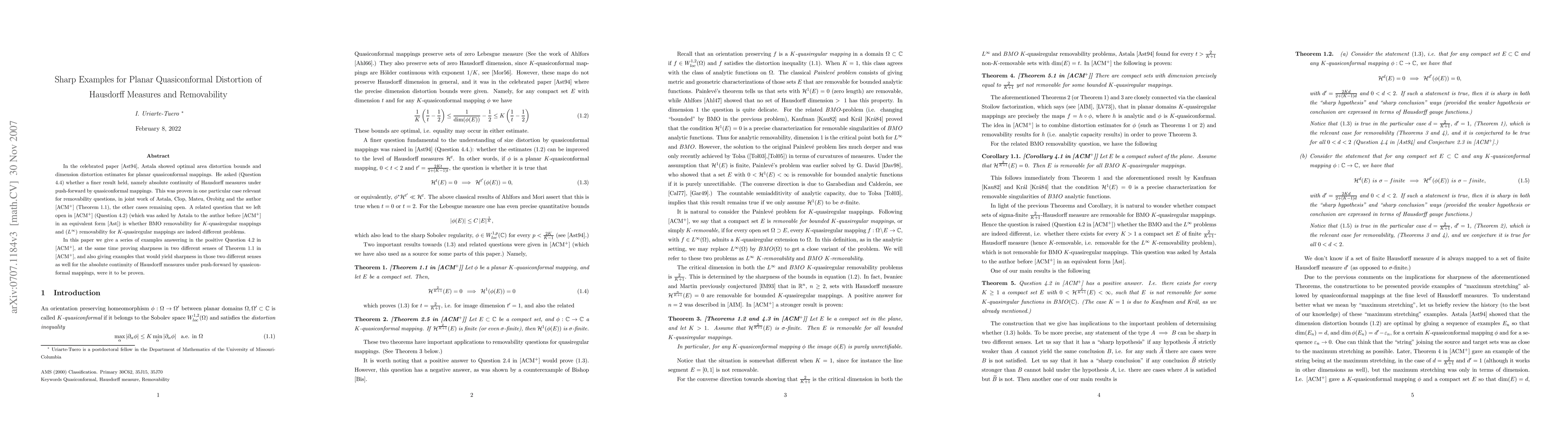In his celebrated paper on area distortion for quasiconformal mappings, Astala showed optimal area distortion bounds and dimension distortion estimates for planar quasiconformal mappings. He asked (Question 4.4) whether a finer result held, namely absolute continuity of Hausdorff measures under push-forward by quasiconformal mappings. This was proved in one particular case relevant for removability questions, in joint work of Astala, Clop, Mateu, Orobitg and the author ("Distortion of Hausdorff measures and improved Painlev'e removability for bounded quasiregular mappings", Duke Math J., to appear [ACMOU]) (Theorem 1.1), the other cases remaining open. A related question that we left open in [ACMOU] (Question 4.2) (which was asked by Astala to the author before [ACMOU] in an equivalent form in a personal communication) is whether BMO removability for K-quasiregular mappings and ($L^{\infty}$) removability for K-quasiregular mappings are indeed different problems. In this paper we give a series of examples answering in the positive Question 4.2 in [ACMOU], at the same time proving sharpness in two different senses of Theorem 1.1 in [ACMOU], and also giving examples that would yield sharpness in those two different senses as well for the absolute continuity of Hausdorff measures under push-forward by quasiconformal mappings, were it to be proved.