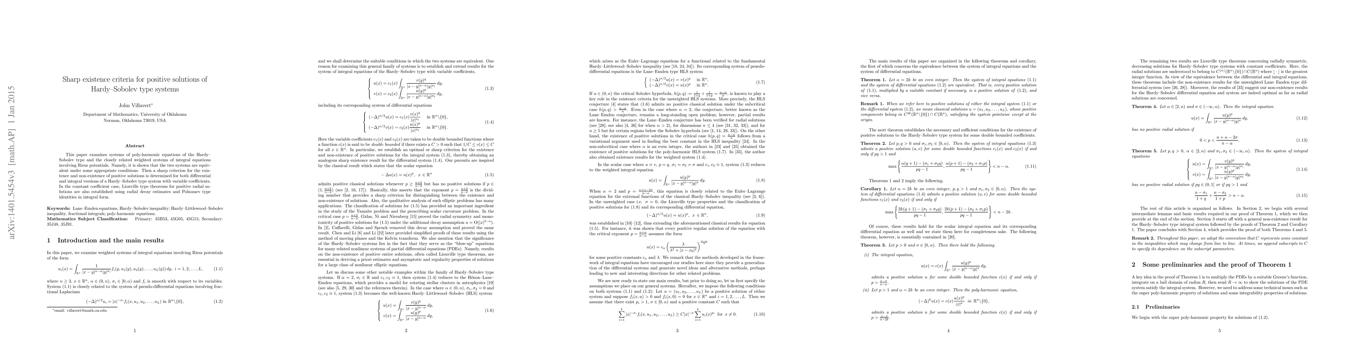This paper establishes equivalence between Hardy-Sobolev type differential systems and their integral counterparts, and determines a sharp criterion for the existence of positive solutions under variable coefficients. Additionally, it proves Liouville theorems for positive radial solutions in the constant coefficient case.