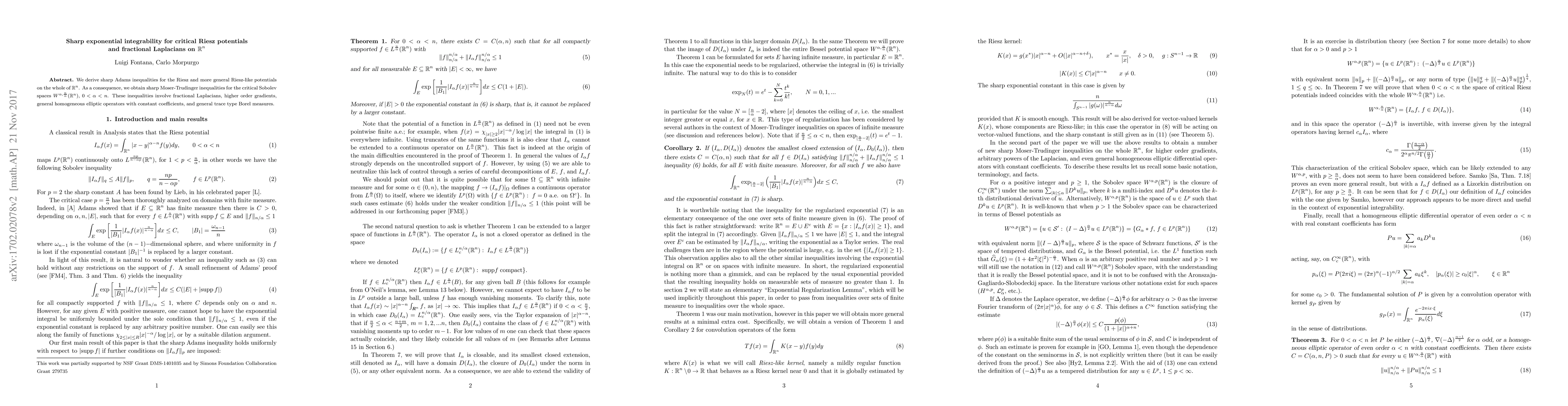 Summary: The paper establishes sharp Adams inequalities for Riesz potentials on R^n, leading to corresponding sharp Moser-Trudinger inequalities for critical Sobolev spaces involving fractional Laplacians and higher order gradients.