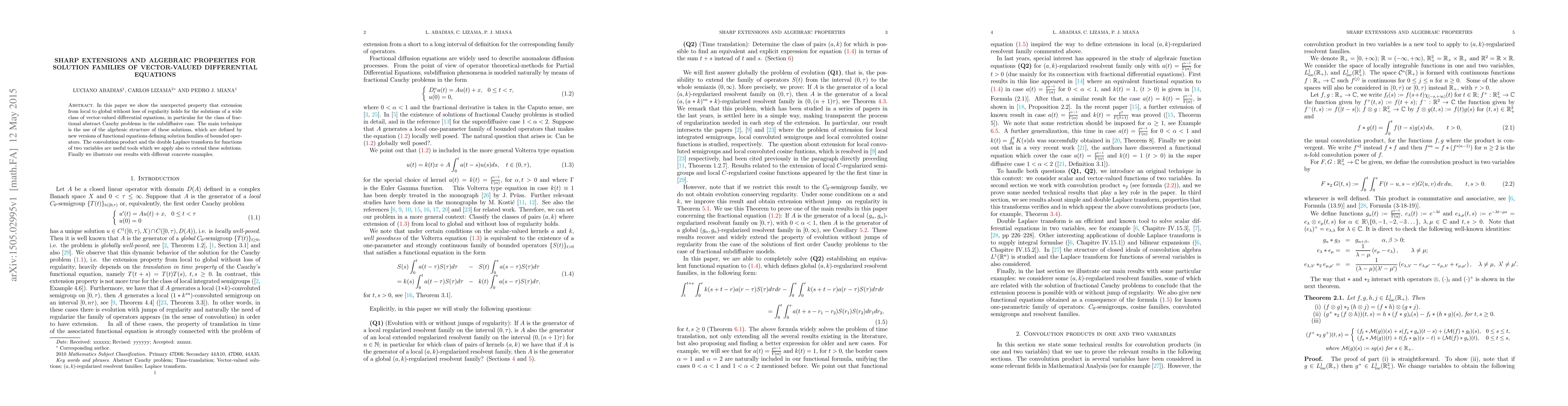 In this paper we show the unexpected property that extension from local to global without loss of regularity holds for the solutions of a wide class of vector-valued differential equations, in particular for the class of fractional abstract Cauchy problems in the subdiffusive case. The main technique is the use of the algebraic structure of these solutions, which are defined by new versions of functional equations defining solution families of bounded operators. The convolution product and the double Laplace transform for functions of two variables are useful tools which we apply also to extend these solutions. Finally we illustrate our results with different concrete examples.