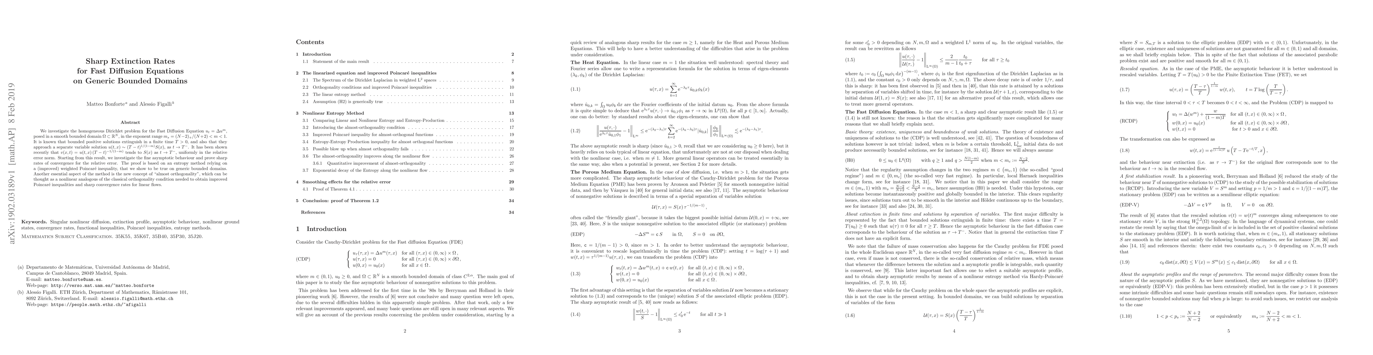 This paper investigates the extinction rates for fast diffusion equations in bounded domains, proving sharp convergence rates for the relative error as solutions approach their extinction time. The study employs an entropy method and a novel "almost orthogonality" concept to derive these rates, leveraging an improved weighted Poincaré inequality.