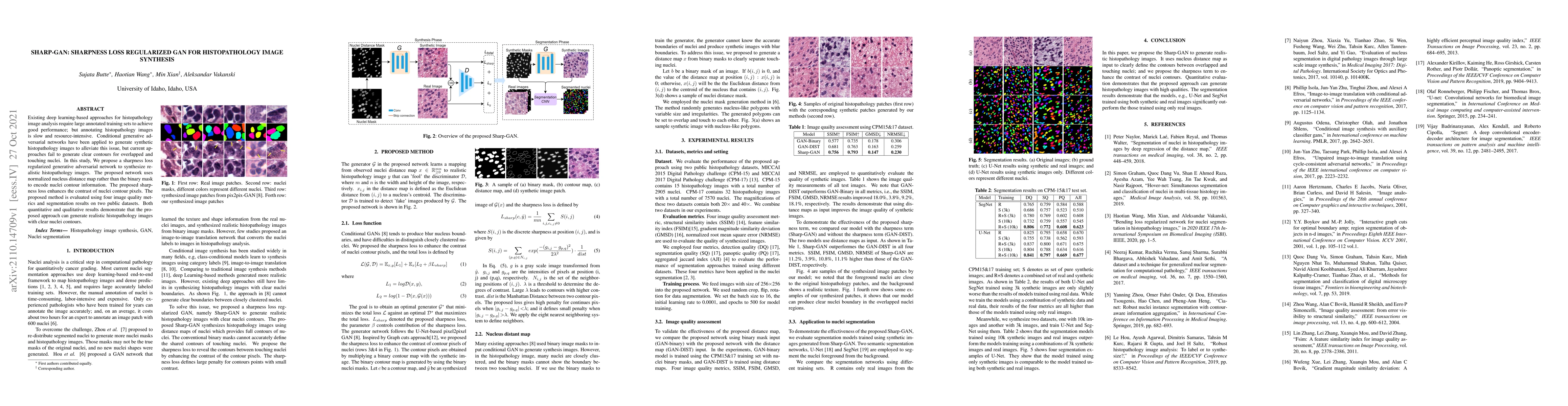 The paper proposes a sharpness loss regularized GAN to synthesize realistic histopathology images with clear nuclei contours, addressing the issue of generating clear contours for overlapped and touching nuclei. The method uses a normalized nucleus distance map to encode nuclei contour information and is evaluated using four image quality metrics and segmentation results, showing superior performance.