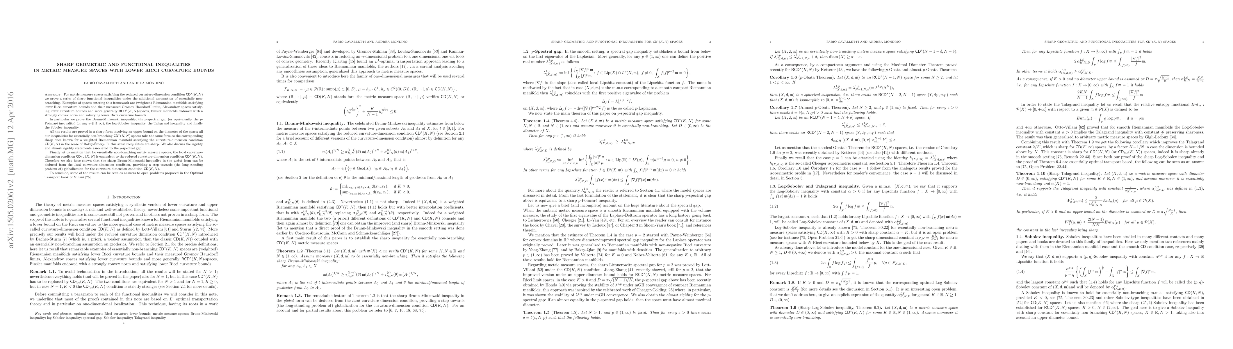 This paper proves sharp geometric and functional inequalities in metric measure spaces with lower Ricci curvature bounds, including the Brunn-Minkowski, $p$-spectral, log-Sobolev, Talagrand, and Sobolev inequalities. The results hold under the reduced curvature-dimension condition $CD^*(K,N)$ and essentially non-branching assumptions, and are shown to be sharp with an upper bound on the diameter.