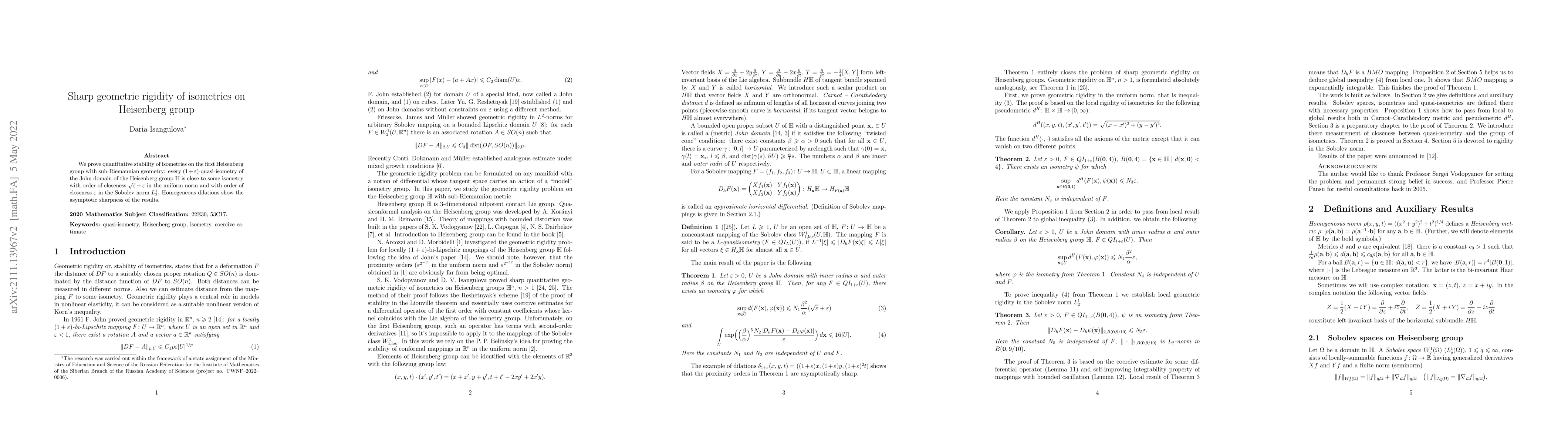 We prove quantitative stability of isometries on the first Heisenberg group with sub-Riemannian geometry: every $ (1+ \varepsilon)$-quasi-isometry of the John domain of the Heisenberg group $ \mathbb {H} $ is close to some isometry with order of closeness $ \sqrt{\varepsilon} + \varepsilon $ in the uniform norm and with order of closeness $ \varepsilon $ in the Sobolev norm $L_2^1$. Homogeneous dilations show the asymptotic sharpness of the results.