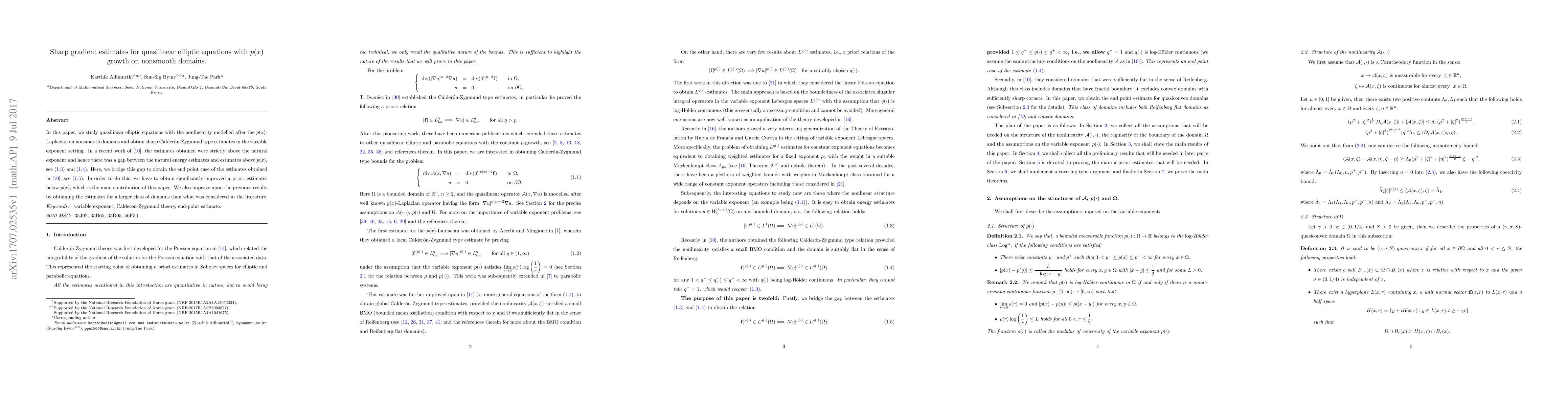 This paper studies quasilinear elliptic equations with $p(x)$-growth on nonsmooth domains, achieving sharp Calderón-Zygmund type estimates. It bridges a gap in previous estimates by obtaining improved a priori estimates below $p(x)$ and extends results to a broader class of domains.