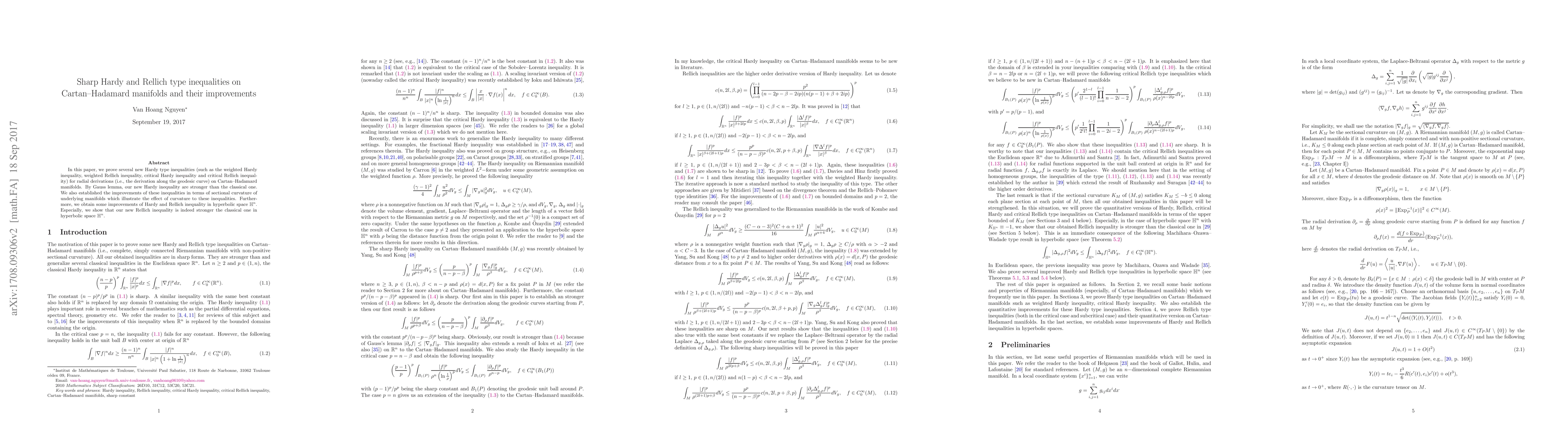 In this paper, we prove several new Hardy type inequalities (such as the weighted Hardy inequality, weighted Rellich inequality, critical Hardy inequality and critical Rellich inequality) for radial derivations (i.e., the derivation along the geodesic curve) on Cartan--Hadamard manifolds. By Gauss lemma, our new Hardy inequality are stronger than the classical one. We also established the improvements of these inequalities in terms of sectional curvature of underlying manifolds which illustrate the effect of curvature to these inequalities. Furthermore, we obtain some improvements of Hardy and Rellich inequality in hyperbolic space $\mathbb H^n$. Especially, we show that our new Rellich inequality is indeed stronger the classical one in hyperbolic space $\mathbb H^n$.