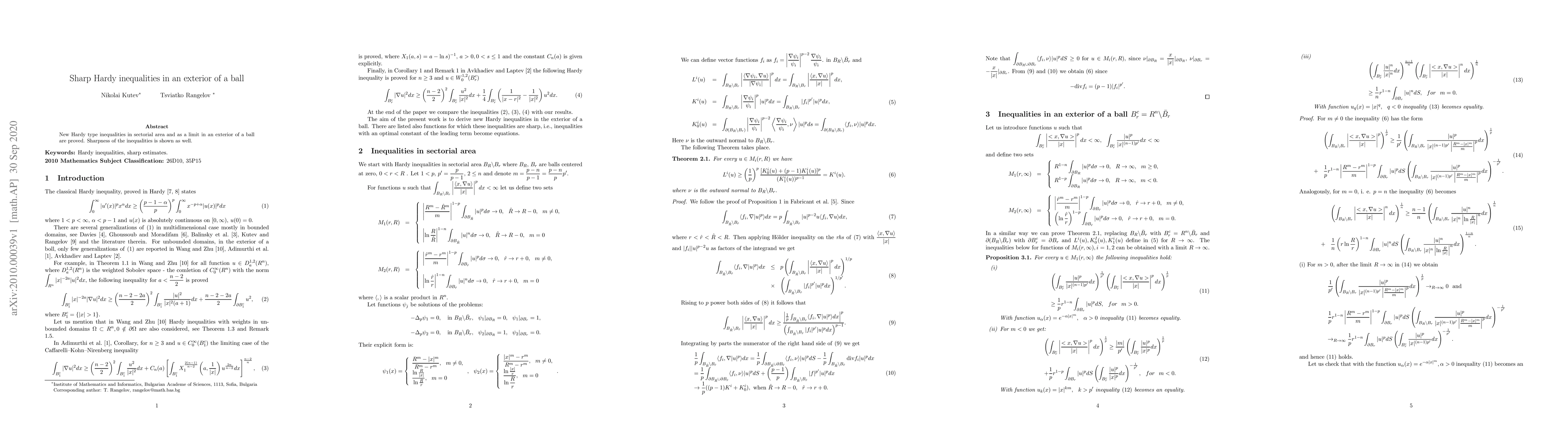 New Hardy type inequalities in sectorial area and as a limit in an exterior of a ball are proved. Sharpness of the inequalities is shown as well.