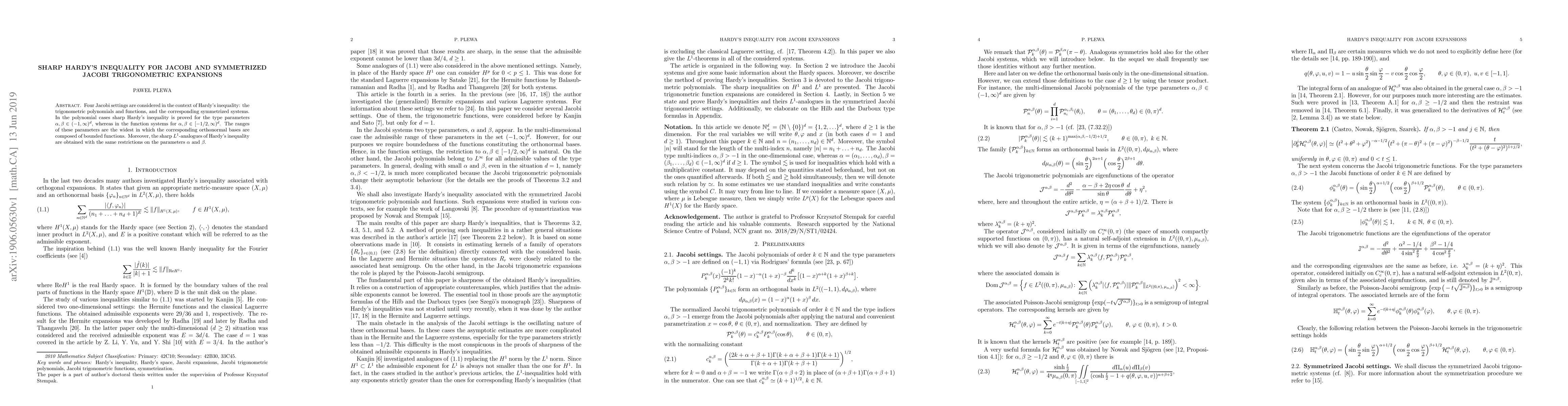 Four Jacobi settings are considered in the context of Hardy's inequality: the trigonometric polynomials and functions, and the corresponding symmetrized systems. In the polynomial cases sharp Hardy's inequality is proved for the type parameters $\alpha,\beta\in(-1,\infty)^d$, whereas in the function systems for $\alpha,\beta\in[-1/2,\infty)^d$. The ranges of these parameters are the widest in which the corresponding orthonormal bases are composed of bounded functions. Moreover, the sharp $L^1$-analogues of Hardy's inequality are obtained with the same restrictions on the parameters $\alpha$ and $\beta$.
