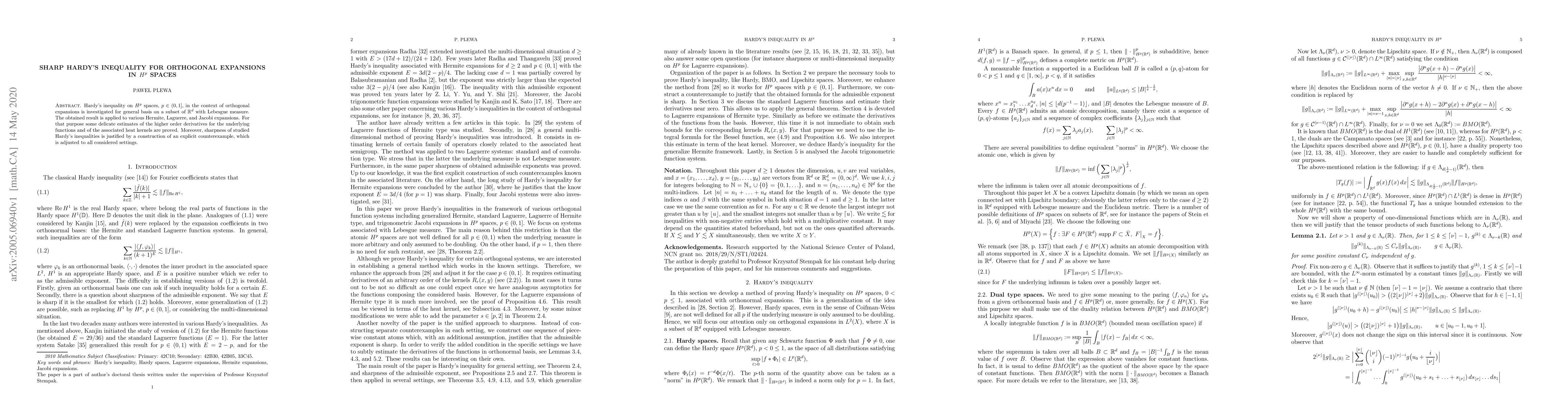 This paper investigates Hardy's inequality in $H^p$ spaces for orthogonal expansions using general bases on subsets of $\mathbb{R}^d$. It applies the results to Hermite, Laguerre, and Jacobi expansions, proving sharp estimates and constructing explicit counterexamples to justify the sharpness of the inequalities.