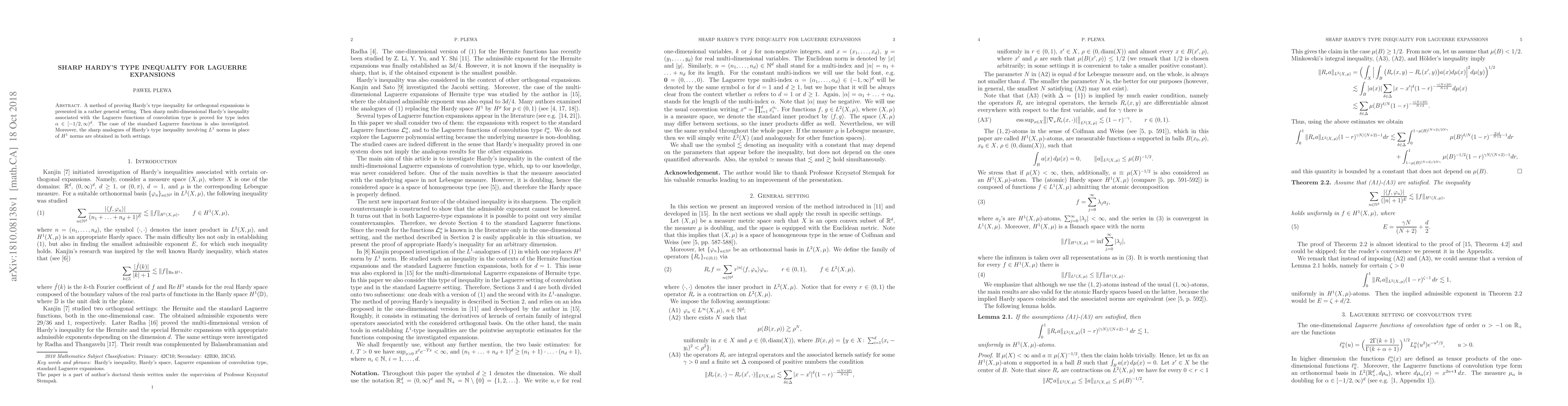 The paper presents a method for proving Hardy's type inequality for orthogonal expansions in a general setting, focusing on multi-dimensional inequalities associated with Laguerre functions of convolution type for index $\alpha \in [-1/2, \infty)^d$. It also investigates the standard Laguerre functions and derives sharp analogues of Hardy's type inequality involving $L^1$ norms.