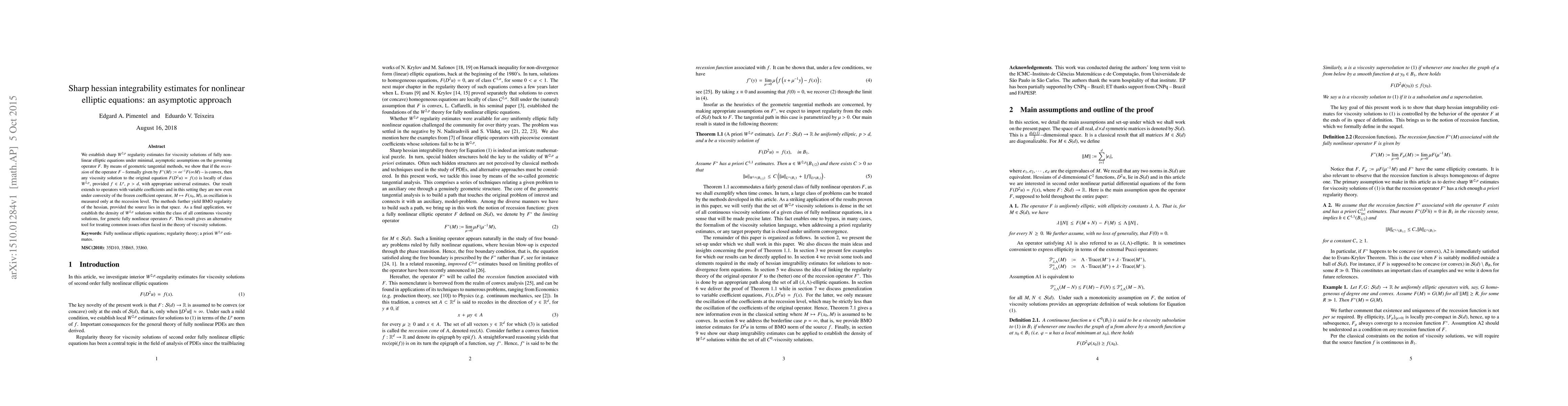 We establish sharp $W^{2,p}$ regularity estimates for viscosity solutions of fully nonlinear elliptic equations under minimal, asymptotic assumptions on the governing operator $F$. By means of geometric tangential methods, we show that if the {\it recession} of the operator $F$ -- formally given by $F^*(M):=\infty^{-1} F(\infty M)$ -- is convex, then any viscosity solution to the original equation $F(D^2u) = f(x)$ is locally of class $W^{2,p}$, provided $f\in L^p$, $p>d$, with appropriate universal estimates. Our result extends to operators with variable coefficients and in this setting they are new even under convexity of the frozen coefficient operator, $M\mapsto F(x_0, M)$, as oscillation is measured only at the recession level. The methods further yield BMO regularity of the hessian, provided the source lies in that space. As a final application, we establish the density of $W^{2,p}$ solutions within the class of all continuous viscosity solutions, for generic fully nonlinear operators $F$. This result gives an alternative tool for treating common issues often faced in the theory of viscosity solutions.