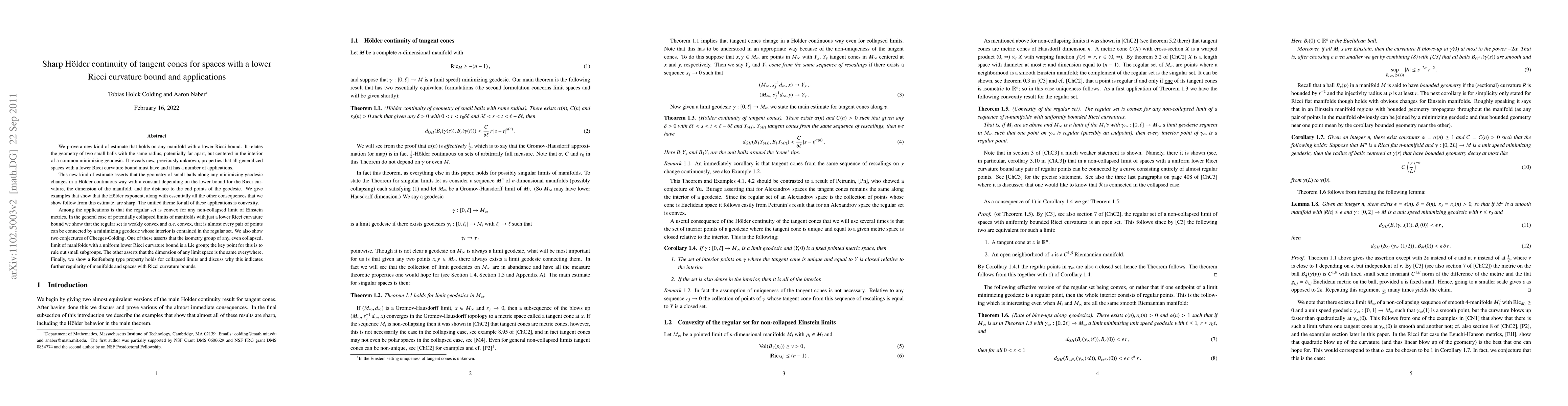 We prove a new kind of estimate that holds on any manifold with lower Ricci bounds. It relates the geometry of two small balls with the same radius, potentially far apart, but centered in the interior of a common minimizing geodesic. It reveals new, previously unknown, properties that all generalized spaces with a lower Ricci curvature bound must have and it has a number of applications. This new kind of estimate asserts that the geometry of small balls along any minimizing geodesic changes in a H\"older continuous way with a constant depending on the lower bound for the Ricci curvature, the dimension of the manifold, and the distance to the end points of the geodesic. We give examples that show that the H\"older exponent, along with essentially all the other consequences that we show follow from this estimate, are sharp. The unified theme for all of these applications is convexity. Among the applications is that the regular set is convex for any non-collapsed limit of Einstein metrics. In the general case of potentially collapsed limits of manifolds with just a lower Ricci curvature bound we show that the regular set is weakly convex and $a.e.$ convex, that is almost every pair of points can be connected by a minimizing geodesic whose interior is contained in the regular set. We also show two conjectures of Cheeger-Colding. One of these asserts that the isometry group of any, even collapsed, limit of manifolds with a uniform lower Ricci curvature bound is a Lie group; the key point for this is to rule out small subgroups. The other asserts that the dimension of any limit space is the same everywhere. Finally, we show that a Reifenberg type property holds for collapsed limits and discuss why this indicate further regularity of manifolds and spaces with Ricci curvature bounds.