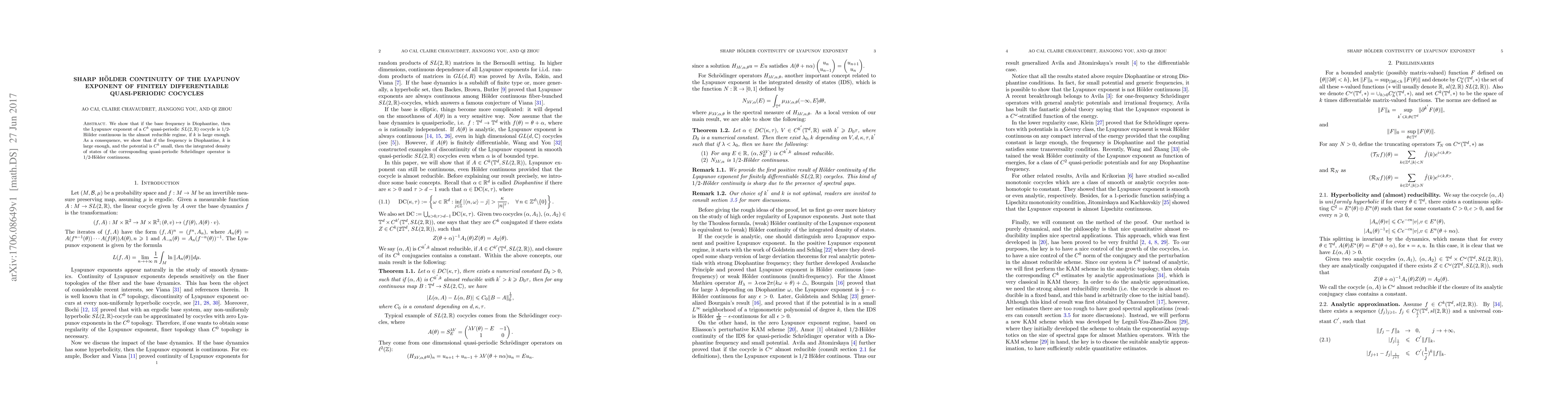 We show that if the base frequency is Diophantine, then the Lyapunov exponent of a $C^{k}$ quasi-periodic $SL(2,\mathbb{R})$ cocycle is $1/2$-H\"older continuous in the almost reducible regime, if $k$ is large enough. As a consequence, we show that if the frequency is Diophantine, $k$ is large enough, and the potential is $C^k$ small, then the integrated density of states of the corresponding quasi-periodic Schr\"odinger operator is $1/2$-H\"older continuous.