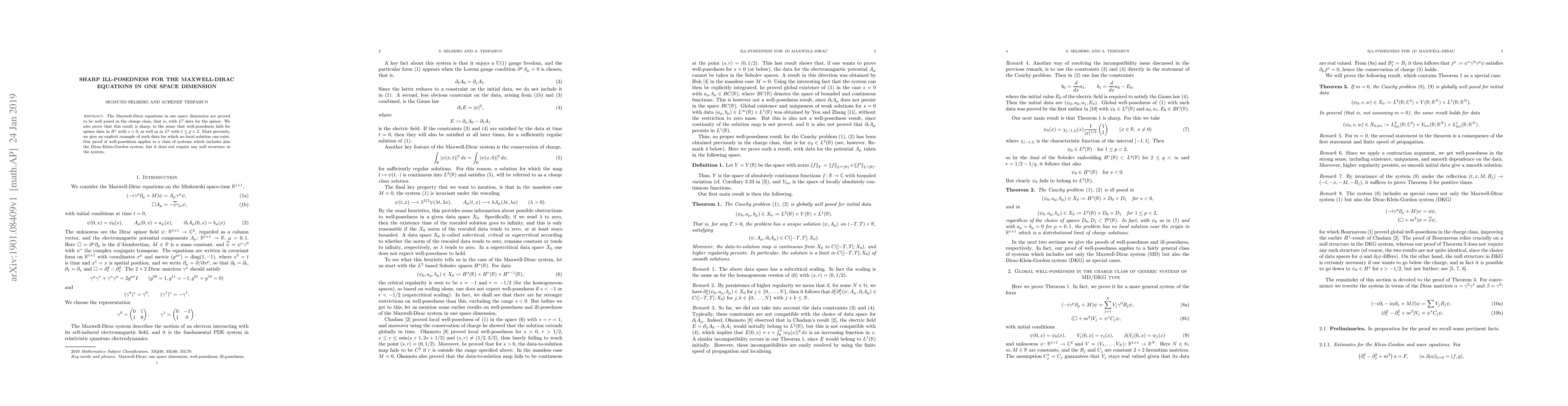 The Maxwell-Dirac equations in one space dimension are proved to be well posed in the charge class, that is, with $L^2$ data for the spinor. We also prove that this result is sharp, in the sense that well-posedness fails for spinor data in $H^s$ with $s<0$, as well as in $L^p$ with $1 \le p < 2$. More precisely, we give an explicit example of such data for which no local solution can exist. Our proof of well-posedness applies to a class of systems which includes also the Dirac-Klein-Gordon system, but it does not require any null structure in the system.