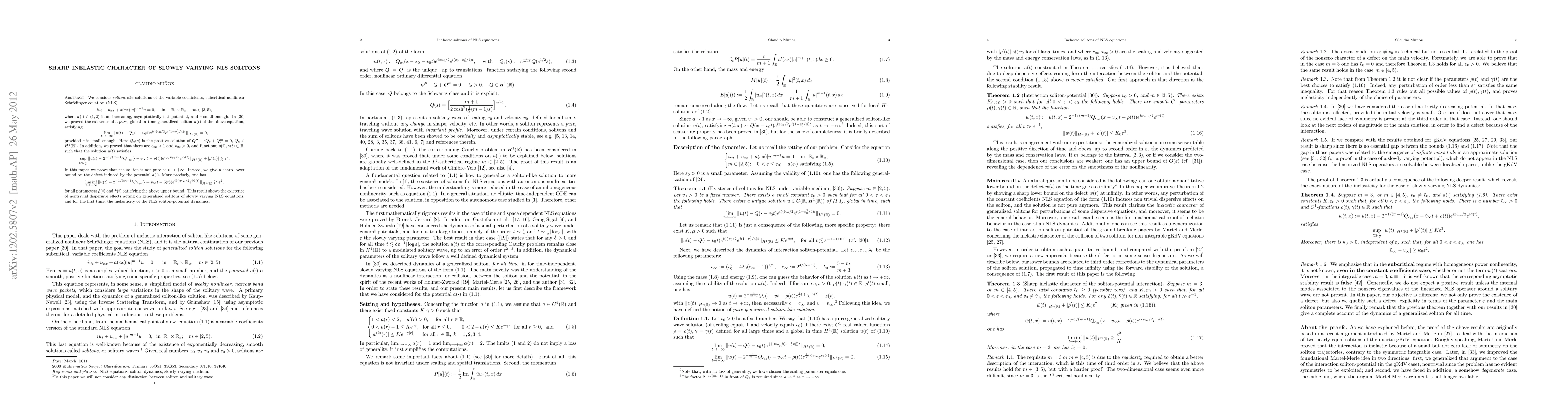 This paper proves that solitons in variable coefficients, subcritical nonlinear Schrödinger equations (NLS) exhibit a sharp inelastic character over time, demonstrating that they cannot remain pure as t approaches infinity. It provides a precise lower bound on the defect induced by the potential, revealing nontrivial dispersive effects on generalized solitons.