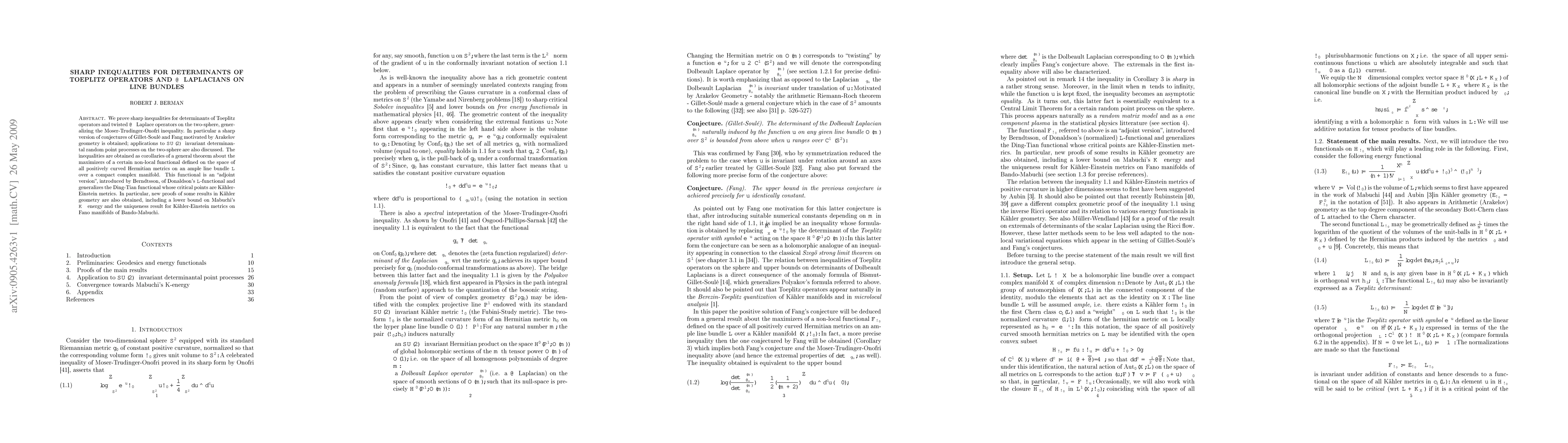 We prove sharp inequalities for determinants of Toeplitz operators and twisted Laplace operators on the two-sphere, generalizing the Moser-Trudinger-Onofri inequality. In particular a sharp version of conjectures of Gillet-Soule and Fang motivated by Arakelov geometry is obtained; applications to SU(2)-invariant determinantal random point processes on the two-sphere are also discussed. The inequalities are obtained as corollaries of a general theorem about the maximizers of a certain non-local functional defined on the space of all positively curved Hermitian metrics on an ample line bundle over a compact complex manifold. This functional is an adjoint version, introduced by Berndtsson, of Donaldson's L-functional and generalizes the Ding-Tian functional whose critical points are Kahler-Einstein metrics. In particular, new proofs of some results in Kahler geometry are also obtained, including a lower bound on Mabuchi's K-energy and the uniqueness result for Kahler-Einstein metrics on Fano manifolds of Bando-Mabuchi.