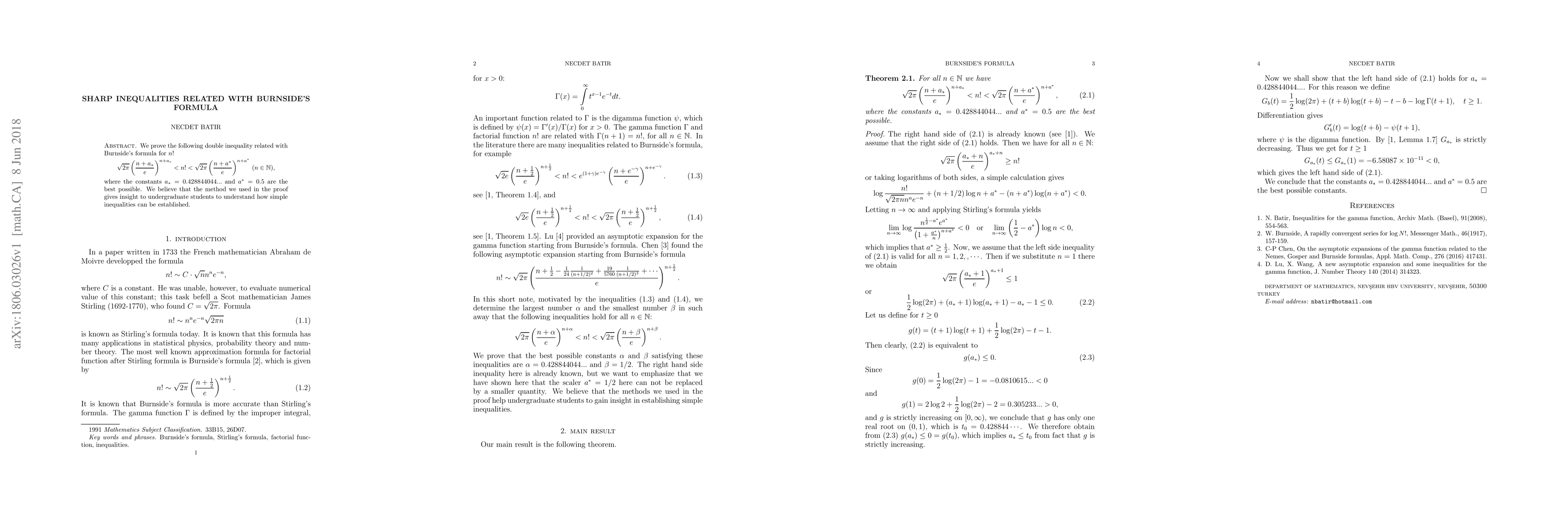 This paper establishes sharp double inequalities for $n!$ based on Burnside's formula, showing that $\sqrt{2\pi}\left(\frac{n+0.428844044...}{e}\right)^{n+0.428844044...} < n! < \sqrt{2\pi}\left(\frac{n+0.5}{e}\right)^{n+0.5}$ for all natural numbers $n$. The method used provides an accessible approach for undergraduates to grasp the derivation of such inequalities.