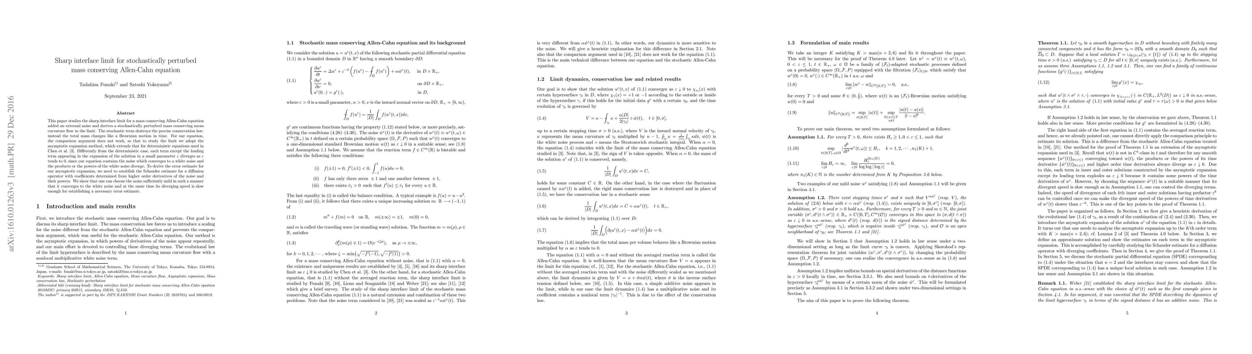This paper studies the sharp interface limit for a mass conserving Allen-Cahn equation added an external noise and derives a stochastically perturbed mass conserving mean curvature flow in the limit. The stochastic term destroys the precise conservation law, instead the total mass changes like a Brownian motion in time. For our equation, the comparison argument does not work, so that to study the limit we adopt the asymptotic expansion method, which extends that for deterministic equations used in Chen et al. [3]. Differently from the deterministic case, each term except the leading term appearing in the expansion of the solution in a small parameter $\epsilon$ diverges as $\epsilon$ tends to $0$, since our equation contains the noise which converges to a white noise and the products or the powers of the white noise diverge. To derive the error estimate for our asymptotic expansion, we need to establish the Schauder estimate for a diffusion operator with coefficients determined from higher order derivatives of the noise and their powers. We show that one can choose the noise sufficiently mild in such a manner that it converges to the white noise and at the same time its diverging speed is slow enough for establishing a necessary error estimate.