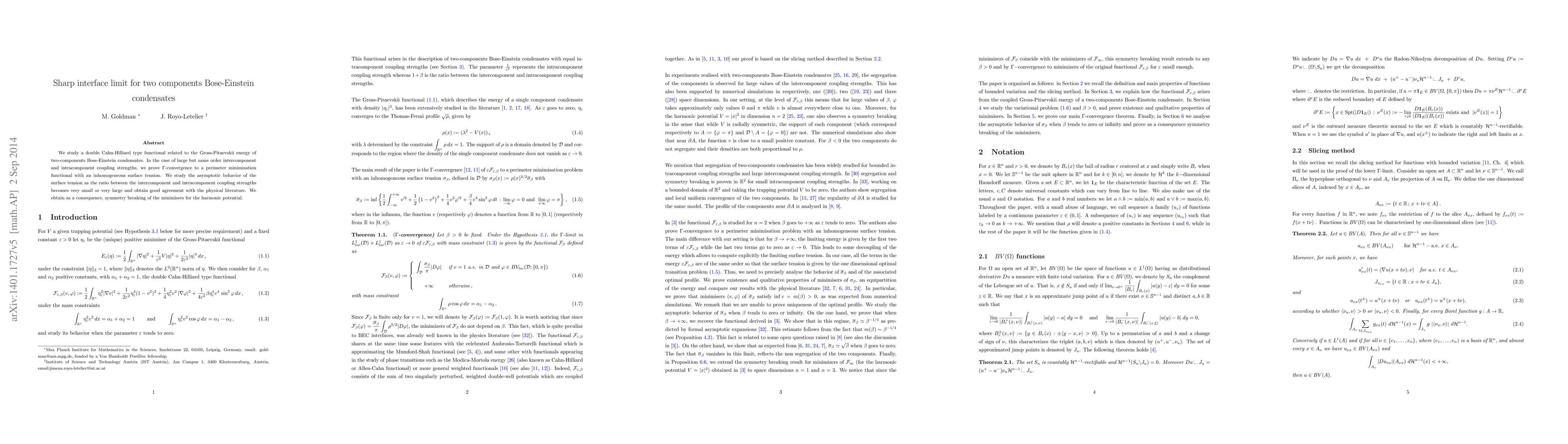 We study a double Cahn-Hilliard type functional related to the Gross-Pitaevskii energy of two-components Bose-Einstein condensates. In the case of large but same order intercomponent and intracomponent coupling strengths, we prove $\Gamma$-convergence to a perimeter minimisation functional with an inhomogeneous surface tension. We study the asymptotic behavior of the surface tension as the ratio between the intercomponent and intracomponent coupling strengths becomes very small or very large. We obtain as a consequence, symmetry breaking of the minimisers for the harmonic potential when this radio is sufficiently large.
