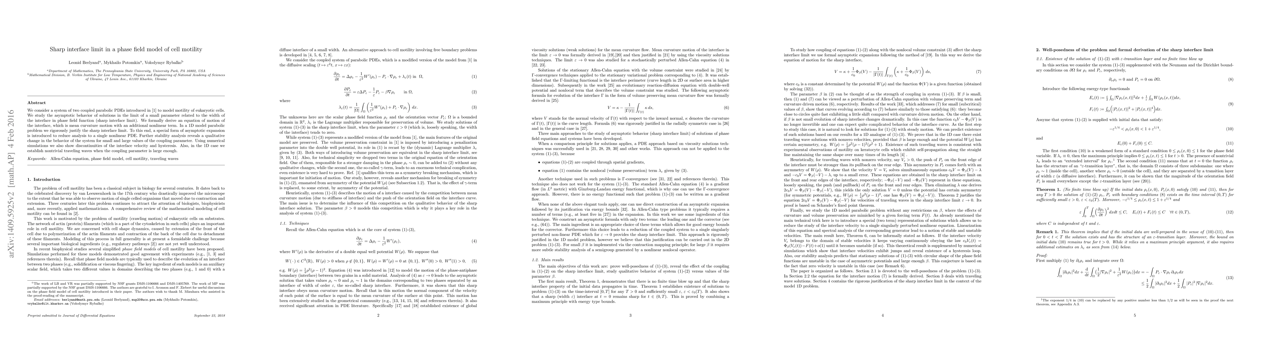 We consider a system of two coupled parabolic PDEs introduced in [1] to model motility of eukaryotic cells. We study the asymptotic behavior of solutions in the limit of a small parameter related to the width of the interface in phase field function (sharp interface limit). We formally derive an equation of motion of the interface, which is mean curvature motion with an additional nonlinear term. In a 1D model parabolic problem we rigorously justify the sharp interface limit. To this end, a special form of asymptotic expansion is introduced to reduce analysis to a single nonlinear PDE. Further stability analysis reveals a qualitative change in the behavior of the system for small and large values of the coupling parameter. Using numerical simulations we also show discontinuities of the interface velocity and hysteresis. Also, in the 1D case we establish nontrivial traveling waves when the coupling parameter is large enough.