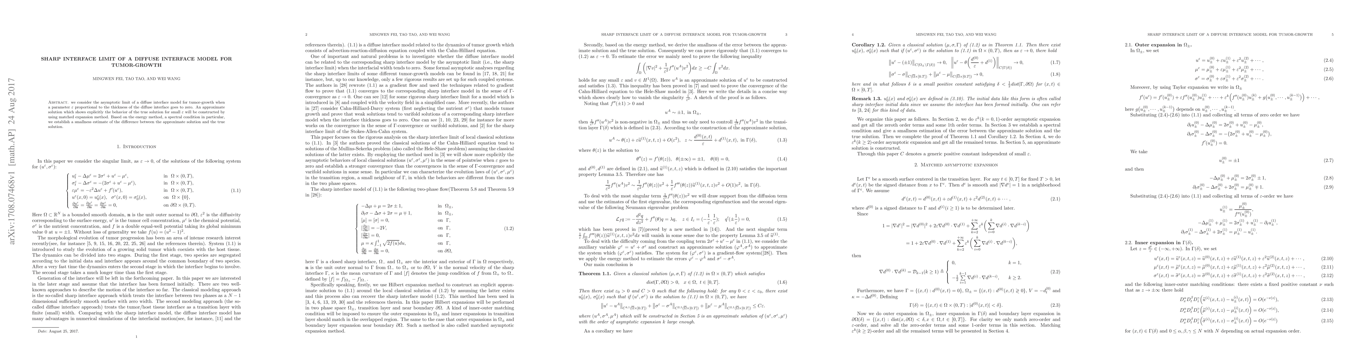 We consider the asymptotic limit of a diffuse interface model for tumor-growth when a parameter $\varepsilon$ proportional to the thickness of the diffuse interface goes to zero. An approximate solution which shows explicitly the behavior of the true solution for small $\varepsilon$ will be constructed by using matched expansion method. Based on the energy method, a spectral condition in particular, we establish a smallness estimate of the difference between the approximate solution and the true solution.