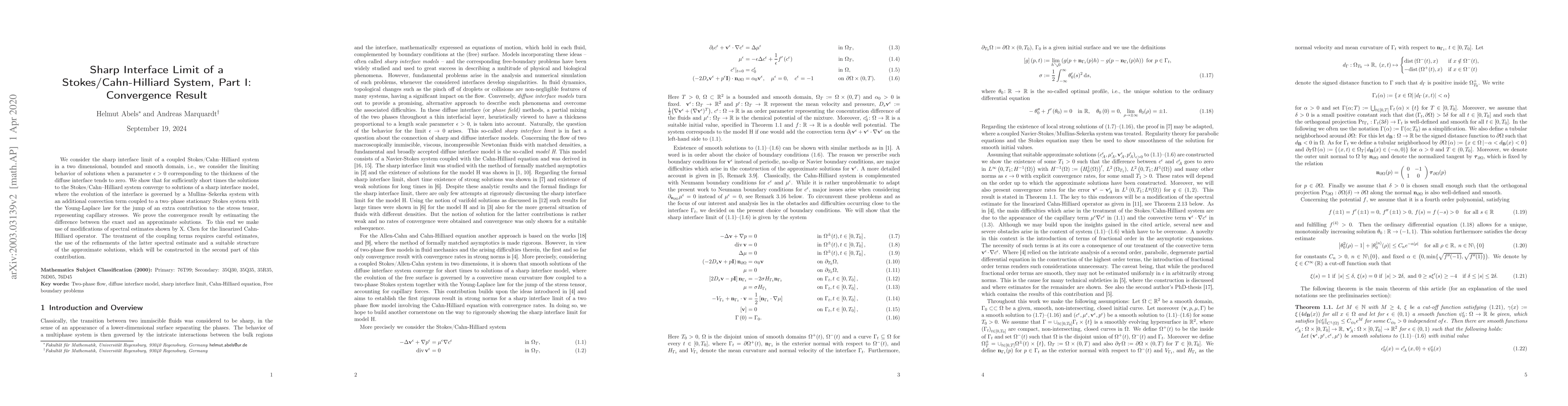 We consider the sharp interface limit of a coupled Stokes/Cahn\textendash Hilliard system in a two dimensional, bounded and smooth domain, i.e., we consider the limiting behavior of solutions when a parameter $\epsilon>0$ corresponding to the thickness of the diffuse interface tends to zero. We show that for sufficiently short times the solutions to the Stokes/Cahn\textendash Hilliard system converge to solutions of a sharp interface model, where the evolution of the interface is governed by a Mullins\textendash Sekerka system with an additional convection term coupled to a two\textendash phase stationary Stokes system with the Young-Laplace law for the jump of an extra contribution to the stress tensor, representing capillary stresses. We prove the convergence result by estimating the difference between the exact and an approximate solutions. To this end we make use of modifications of spectral estimates shown by X.\ Chen for the linearized Cahn-Hilliard operator. The treatment of the coupling terms requires careful estimates, the use of the refinements of the latter spectral estimate and a suitable structure of the approximate solutions, which will be constructed in the second part of this contribution.