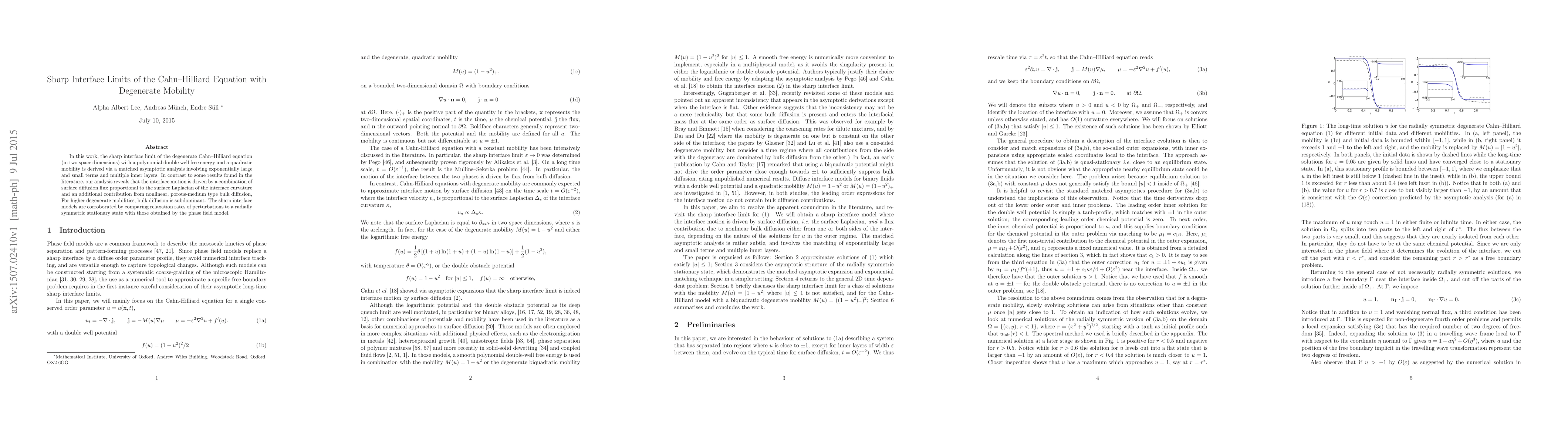 In this work, the sharp interface limit of the degenerate Cahn-Hilliard equation (in two space dimensions) with a polynomial double well free energy and a quadratic mobility is derived via a matched asymptotic analysis involving exponentially large and small terms and multiple inner layers. In contrast to some results found in the literature, our analysis reveals that the interface motion is driven by a combination of surface diffusion flux proportional to the surface Laplacian of the interface curvature and an additional contribution from nonlinear, porous-medium type bulk diffusion, For higher degenerate mobilities, bulk diffusion is subdominant. The sharp interface models are corroborated by comparing relaxation rates of perturbations to a radially symmetric stationary state with those obtained by the phase field model.