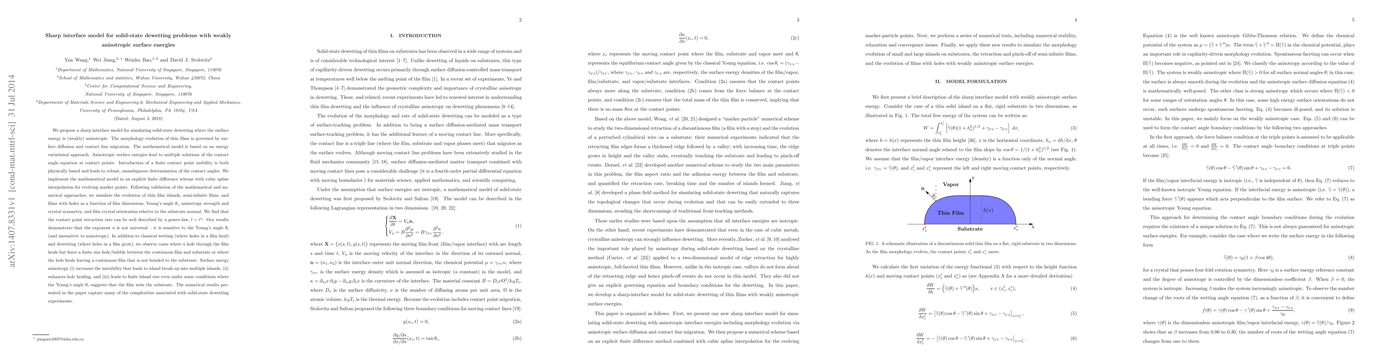 This paper proposes a sharp interface model to simulate solid-state dewetting with weakly anisotropic surface energies, showing that contact angle determination is robust with finite contact point mobility. The model reveals varied film evolution behaviors influenced by factors like Young's angle and anisotropy, including non-universal power-law retraction rates and complex hole healing phenomena.