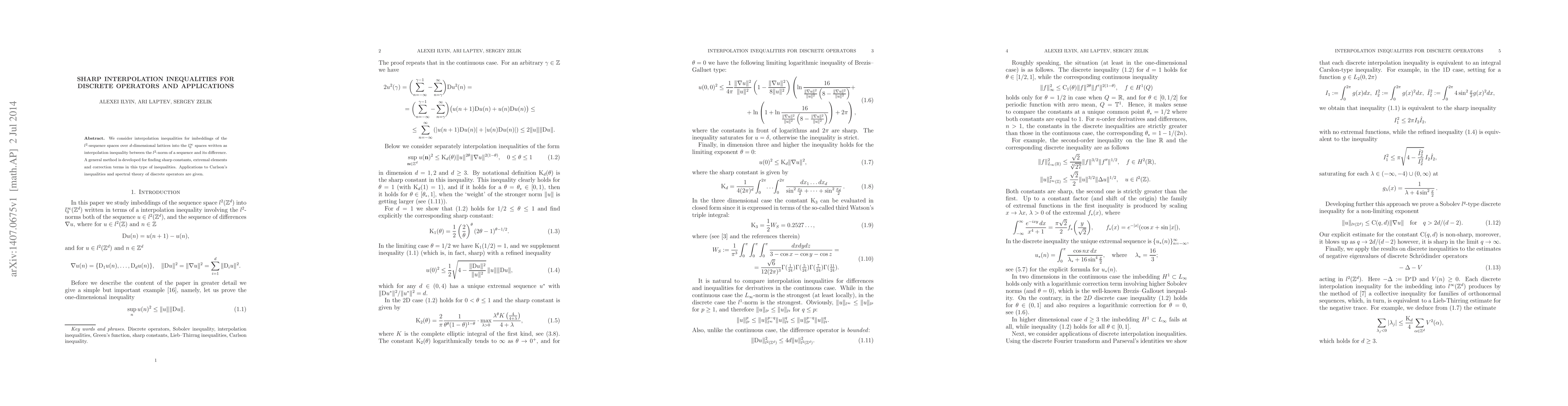 This paper develops a method for deriving sharp interpolation inequalities for discrete operators, focusing on $l^2$-sequence spaces embedded into $l^\infty_0$ spaces. It also applies the findings to Carlson's inequalities and spectral theory of discrete operators.