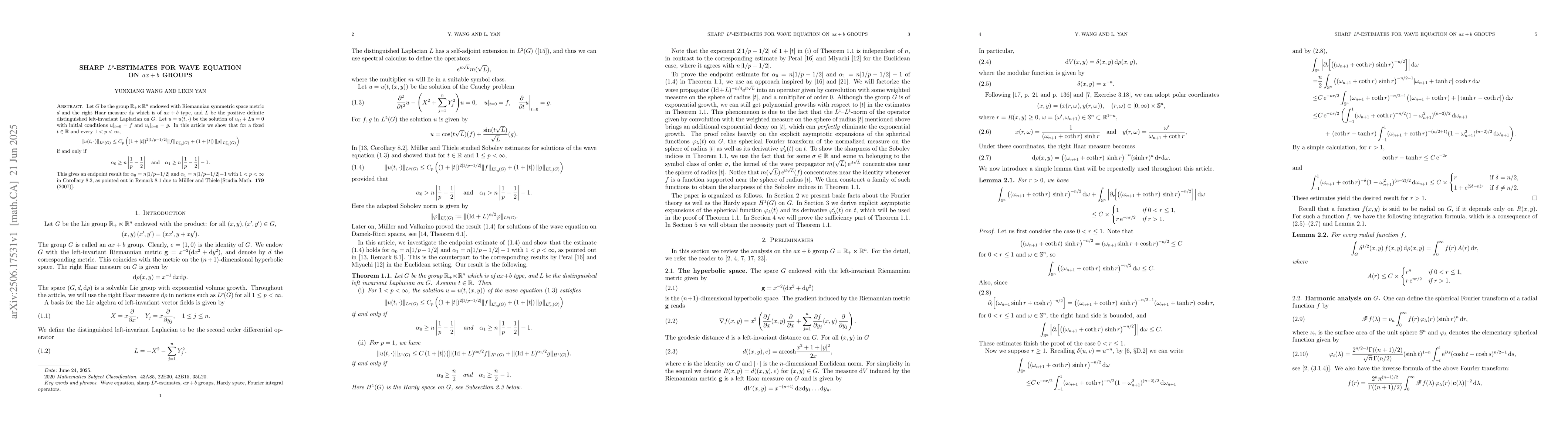 Let $G$ be the group $\mathbb{R}_+\ltimes \mathbb{R}^n$ endowed with Riemannian symmetric space metric $d$ and the right Haar measure $\mathrm{d} \rho$ which is of $ax+b$ type, and $L$ be the positive definite distinguished left invariant Laplacian on $G$. Let $u=u(t,\cdot)$ be the solution of $u_{tt}+Lu=0$ with initial conditions $u|_{t=0}=f$ and $u_t|_{t=0}=g$. In this article we show that for a fixed $t \in{\mathbb R}$ and every $1