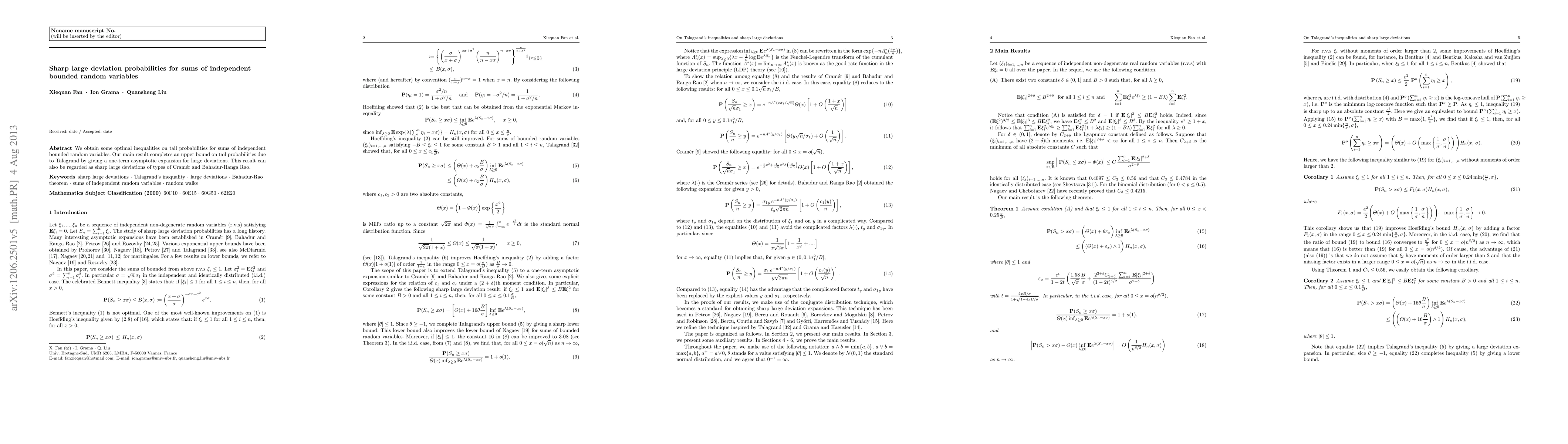 Summary: This paper establishes optimal inequalities on tail probabilities for sums of independent bounded random variables, providing a one-term asymptotic expansion for large deviations that completes Talagrand's upper bound. The findings are seen as sharp large deviation results akin to Cramér and Bahadur-Ranga Rao types.