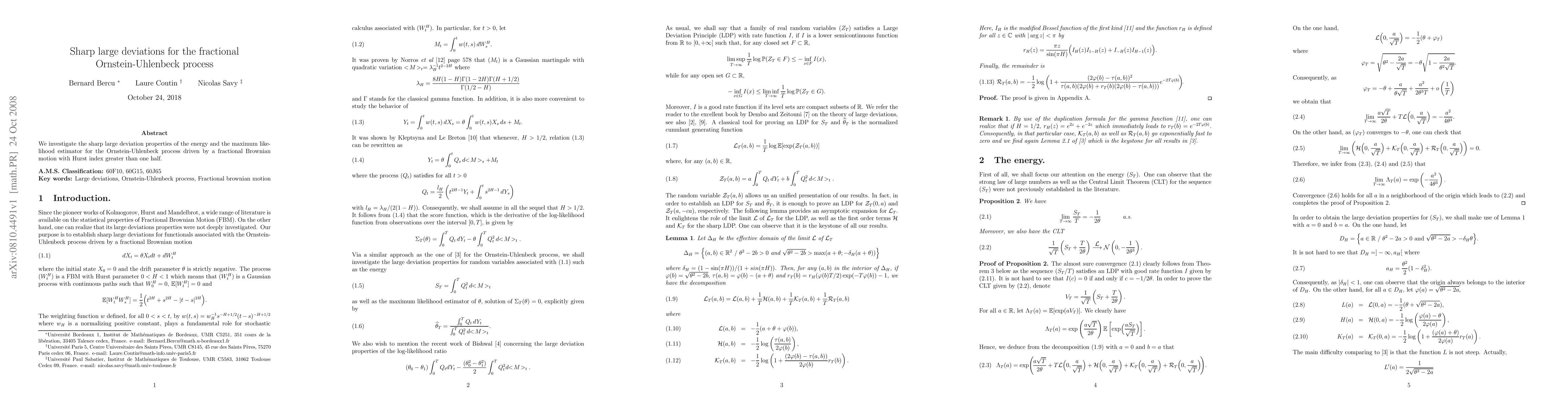 We investigate the sharp large deviation properties of the energy and the maximum likelihood estimator for the Ornstein-Uhlenbeck process driven by a fractional Brownian motion with Hurst index greater than one half.