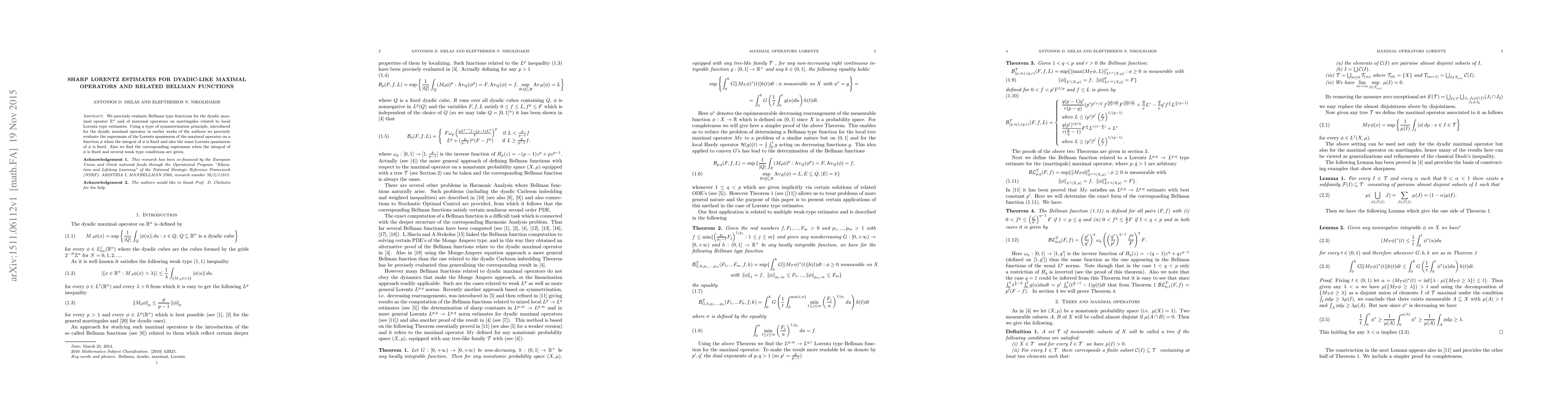 This paper evaluates Bellman functions for dyadic maximal operators and related martingales, focusing on sharp Lorentz estimates. It employs a symmetrization principle to determine the supremum of the Lorentz quasinorm under fixed integral and quasinorm conditions.