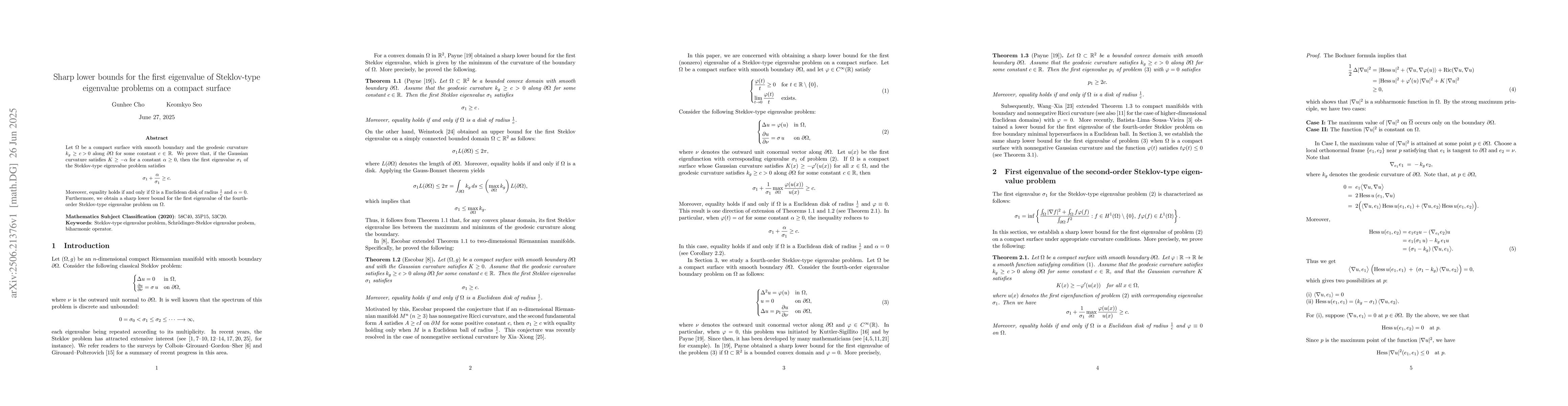 Let $\Omega$ be a compact surface with smooth boundary and the geodesic curvature $k_g \ge {c > 0}$ along $\partial \Omega$ for some constant $c \in \mathbb{R}$. We prove that, if the Gaussian curvature satisfies $K \ge -\alpha$ for a constant $\alpha \ge 0$, then the first eigenvalue $\sigma_1$ of the Steklov-type eigenvalue problem satisfies \[ \sigma_1 + \frac{\alpha}{\sigma_1} \ge c. \] Moreover, equality holds if and only if $\Omega$ is a Euclidean disk of radius $\frac{1}{c}$ and $\alpha = 0$. Furthermore, we obtain a sharp lower bound for the first eigenvalue of the fourth-order Steklov-type eigenvalue problem on $\Omega$.