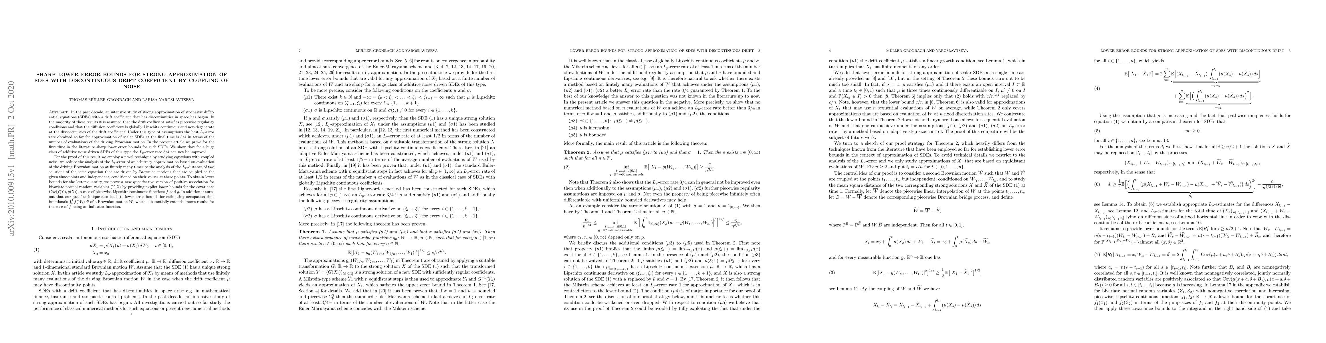In the past decade, an intensive study of strong approximation of stochastic differential equations (SDEs) with a drift coefficient that has discontinuities in space has begun. In the majority of these results it is assumed that the drift coefficient satisfies piecewise regularity conditions and that the diffusion coefficient is globally Lipschitz continuous and non-degenerate at the discontinuities of the drift coefficient. Under this type of assumptions the best $L_p$-error rate obtained so far for approximation of scalar SDEs at the final time is $3/4$ in terms of the number of evaluations of the driving Brownian motion. In the present article we prove for the first time in the literature sharp lower error bounds for such SDEs. We show that for a huge class of additive noise driven SDEs of this type the $L_p$-error rate $3/4$ can not be improved. For the proof of this result we employ a novel technique by studying equations with coupled noise: we reduce the analysis of the $L_p$-error of an arbitrary approximation based on evaluation of the driving Brownian motion at finitely many times to the analysis of the $L_p$-distance of two solutions of the same equation that are driven by Brownian motions that are coupled at the given time-points and independent, conditioned on their values at these points. To obtain lower bounds for the latter quantity, we prove a new quantitative version of positive association for bivariate normal random variables $(Y,Z)$ by providing explict lower bounds for the covariance $\text{Cov}(f(Y),g(Z))$ in case of piecewise Lipschitz continuous functions $f$ and $g$. In addition it turns out that our proof technique also leads to lower error bounds for estimating occupation time functionals $\int_0^1 f(W_t)\, dt$ of a Brownian motion $W$, which substantially extends known results for the case of $f$ being an indicator function.